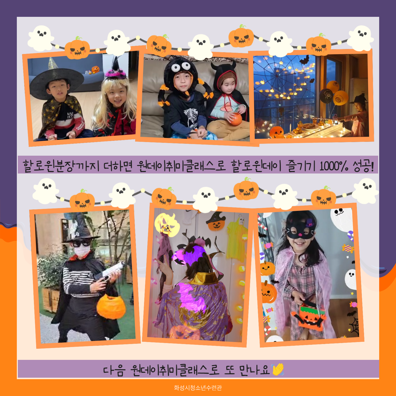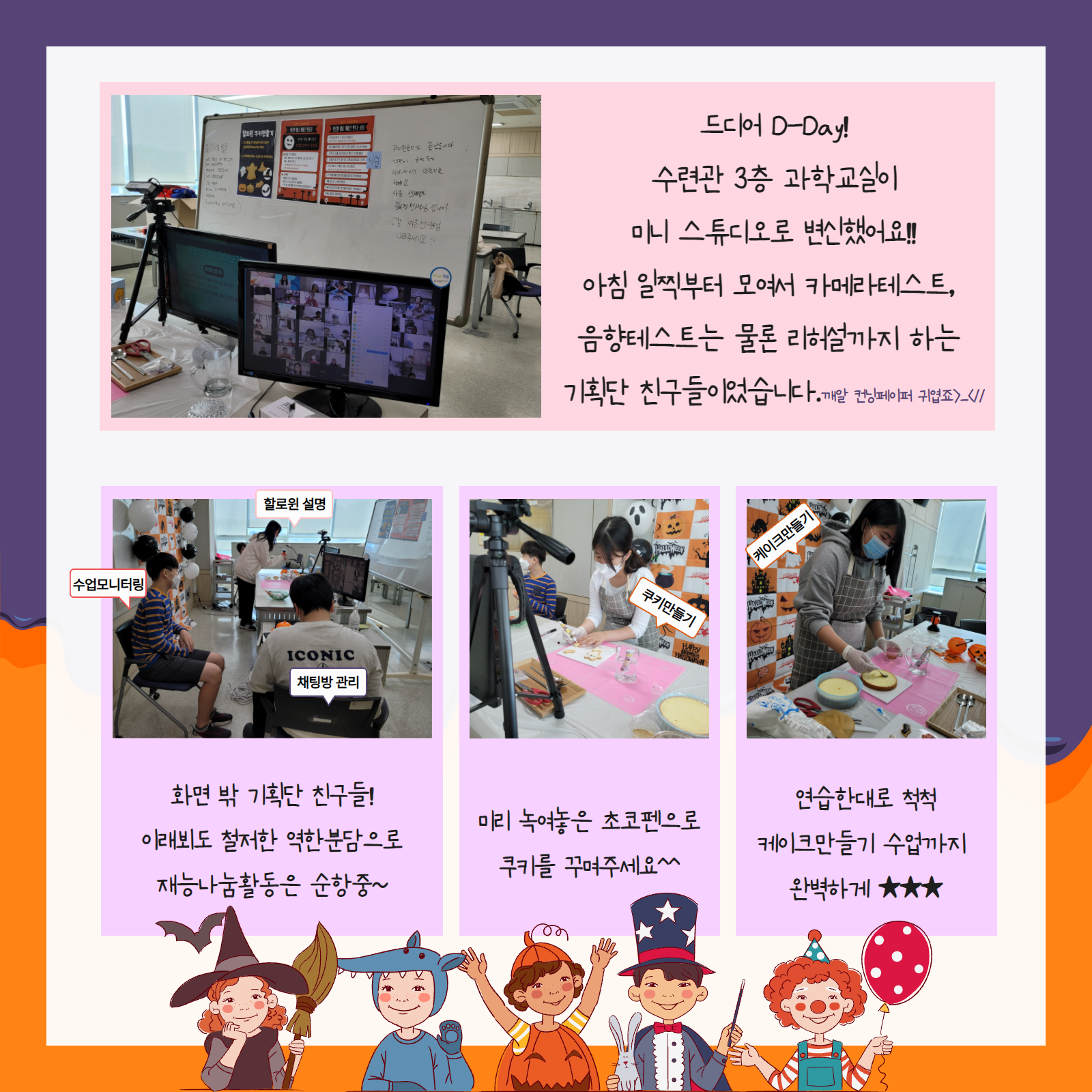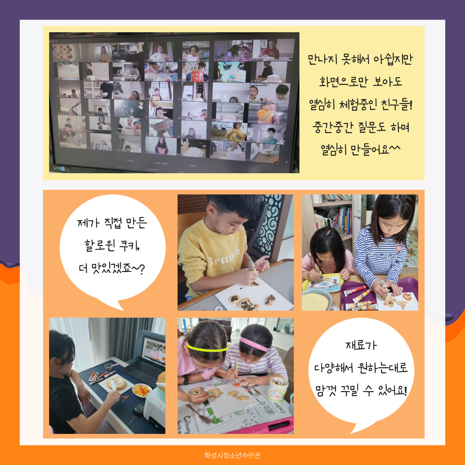 [화성시청소년수련관] 청소년취미공작소 기획단 재능나눔활동 <10월 원데이취미클래스-할로윈케이크만들기> 재단에 바랍니다 상세 운영센터 유앤아이센터 등록일 2021년 11월 3일 11시 16분 조회수 634 #화성시청소년수련관#청소년취미공작소#재능나눔활동#원데이취미클래스취미공작소 기획단 친구들의 10월 재능나눔활동 <원데이취미클래스-할로윈 미니케이크 만들기> 활동이 10월 24일~10월 31일동안 진행되었습니다^^비대면 재능나눔활동은 처음이라,, 기획단 친구들이 더더더! 열심히 준비했는데요덕분에 대 성공>_<//자세한 내용은 카드뉴스로 함께 보아요♥#할로윈체험 #할로윈케이크 #케이크만들기 #할로윈즐기기#청소년취미 #청소년체험 #비대면체험 #원데이클래스 목록보기