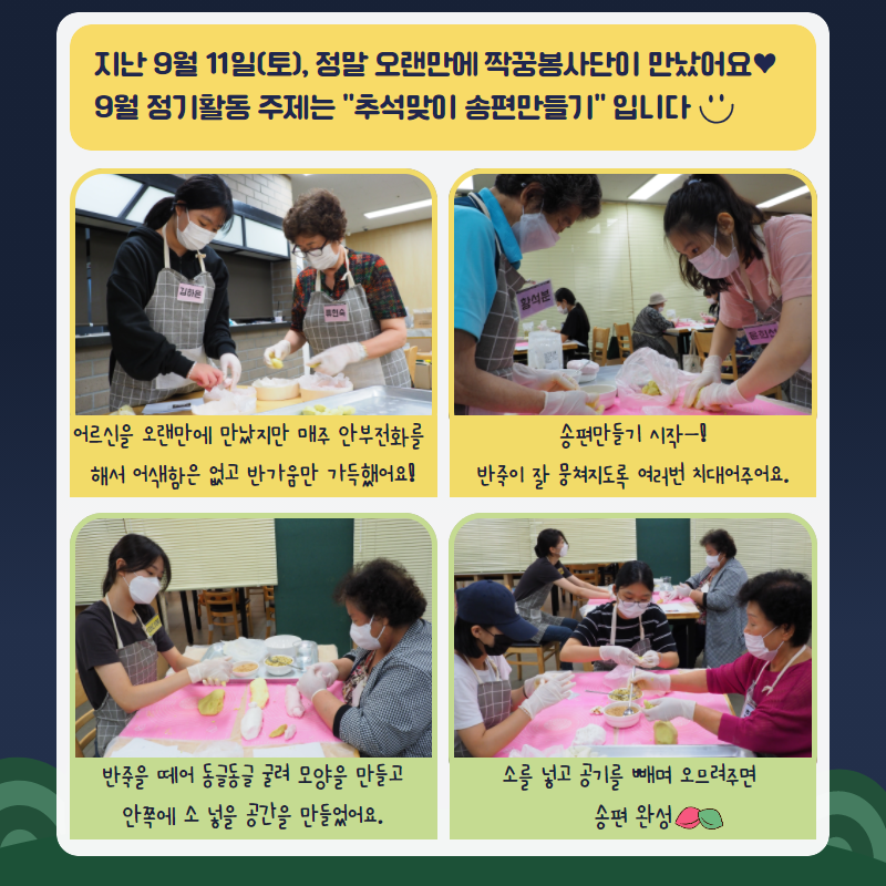 지난 9월 11일(토), 추석을 앞두고 짝꿍봉사단의 송편만들기 활동이 진행되었습니다. 오랜만에 만난 짝꿍어르신과 반갑게 인사하고, 송편을 만들며 도란도란 이야기를 나누니 정말 명절느낌...♥ 다 같이 먹지는 못했지만 집에서 쪄먹어보니 정말 맛있었다는 후기가 가득했답니다=) 다음 10월 정기활동도 기대해주세요^^ *2021 짝꿍봉사단 활동은 화성시청소년수련관과 동탄치동천종합사회복지관이 연계하여 운영됩니다. |