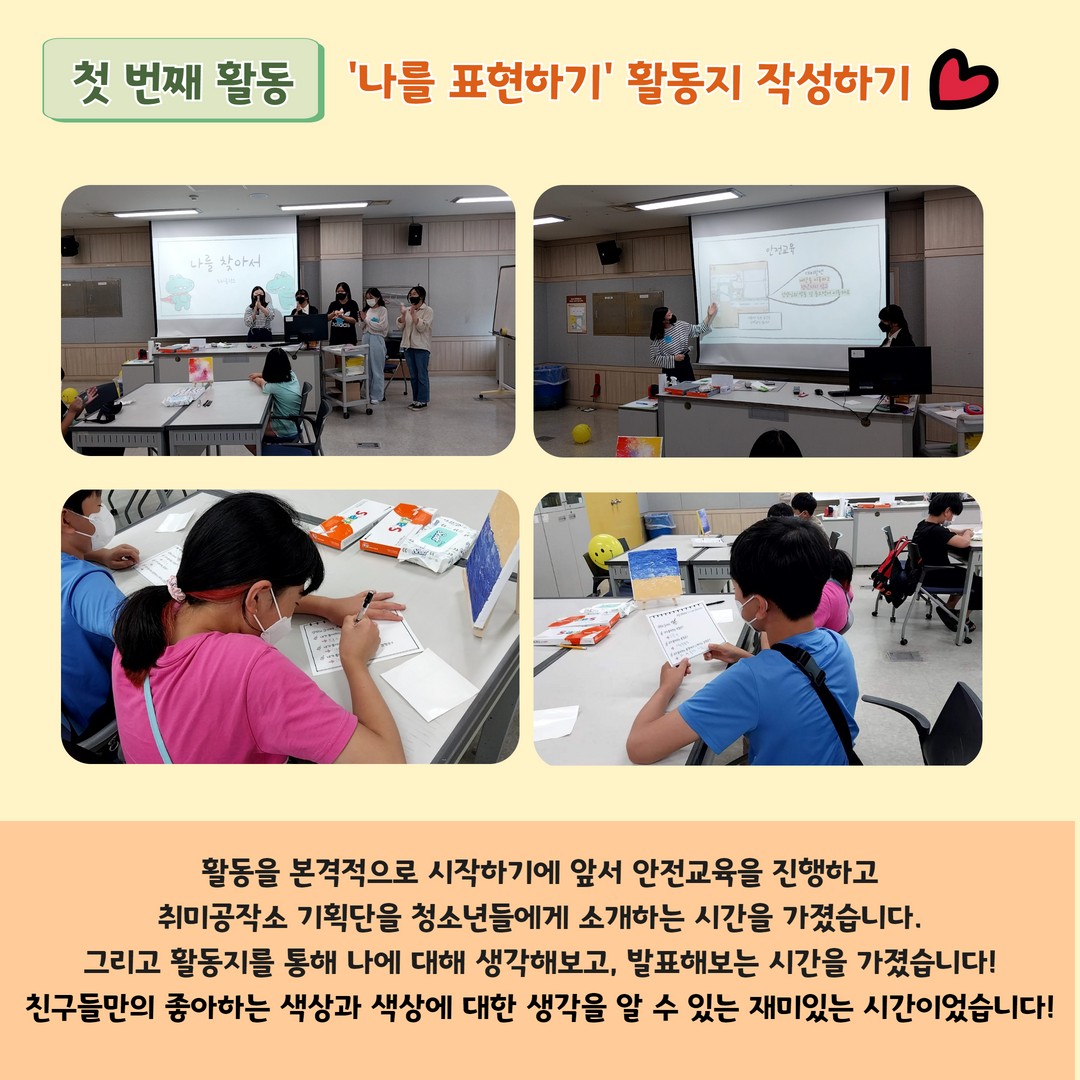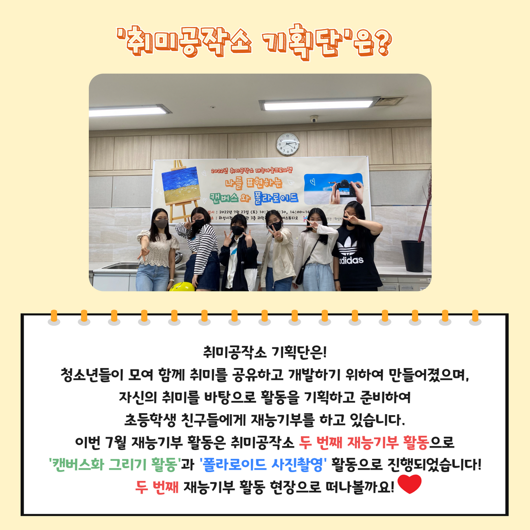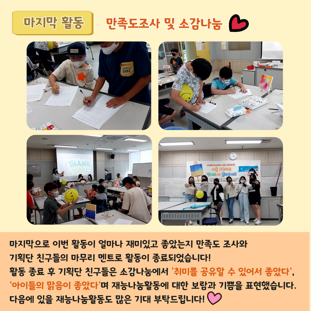 [화성시청소년수련관] 취미공작소 기획단 7월 재능나눔활동 모습 재단에 바랍니다 상세 운영센터 유앤아이센터 등록일 2022년 7월 29일 13시 57분 조회수 588 안녕하세요! 화성시청소년수련관입니다. 7월 23일에 취미공작소 기획단의 재능나눔활동이 진행되었습니다.기획단 친구들이 열심히 준비하고 기획한 재능나눔활동 모습을 지금 카드뉴스로 만나보시죠! 목록보기