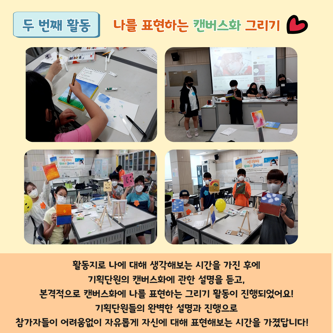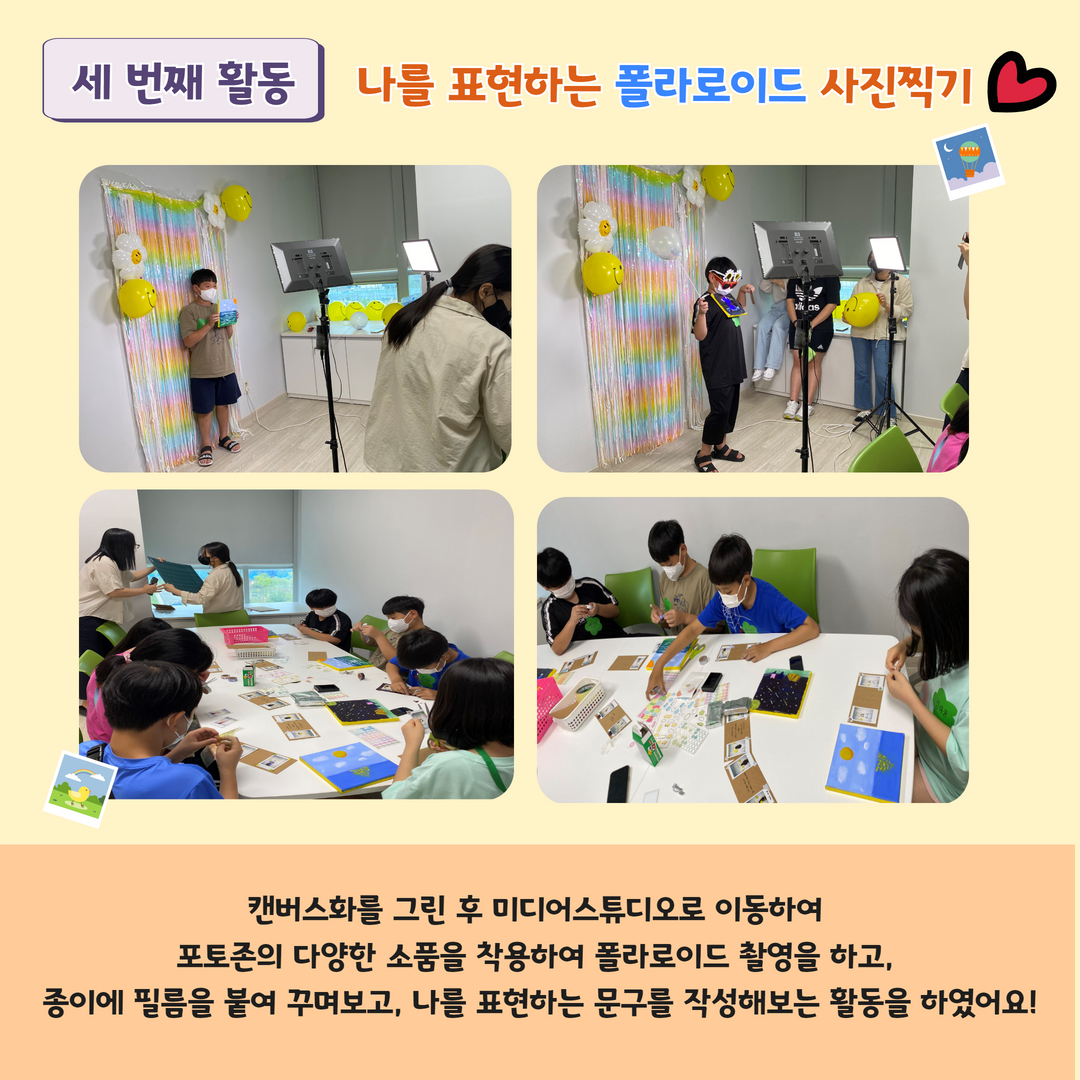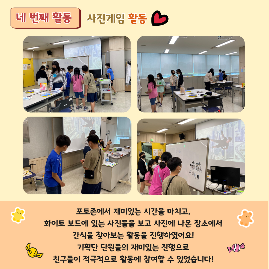 [화성시청소년수련관] 취미공작소 기획단 7월 재능나눔활동 모습 재단에 바랍니다 상세 운영센터 유앤아이센터 등록일 2022년 7월 29일 13시 57분 조회수 588 안녕하세요! 화성시청소년수련관입니다. 7월 23일에 취미공작소 기획단의 재능나눔활동이 진행되었습니다.기획단 친구들이 열심히 준비하고 기획한 재능나눔활동 모습을 지금 카드뉴스로 만나보시죠! 목록보기