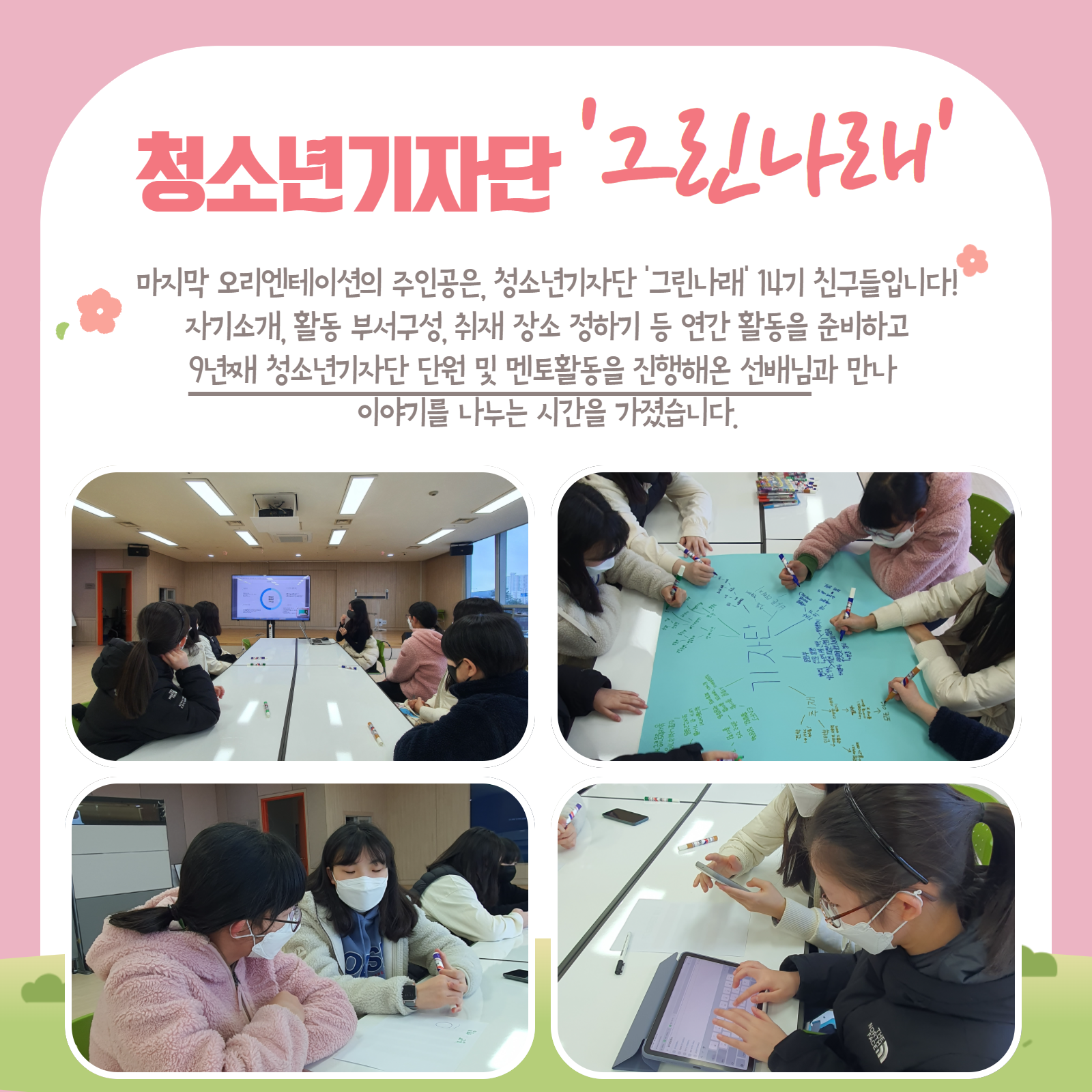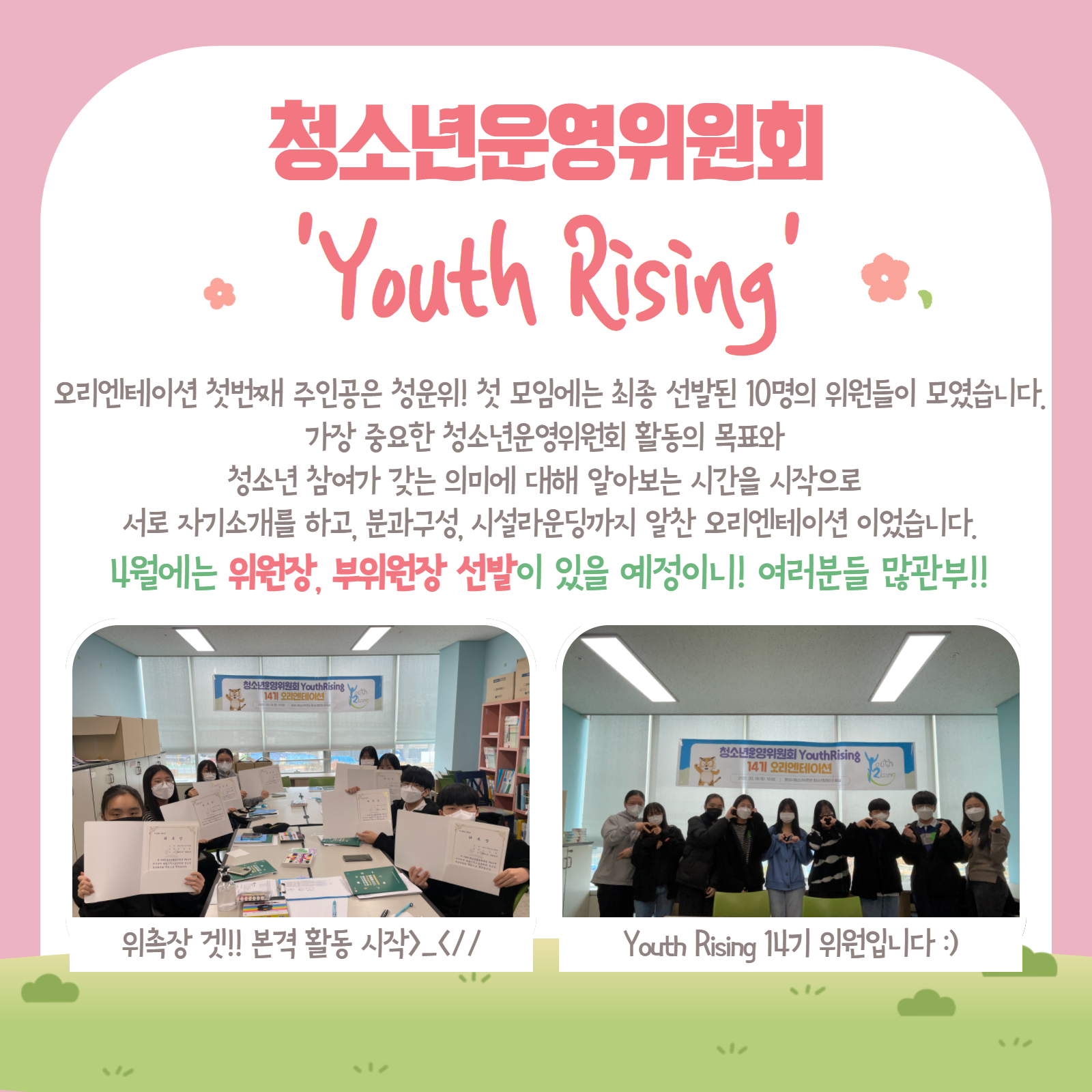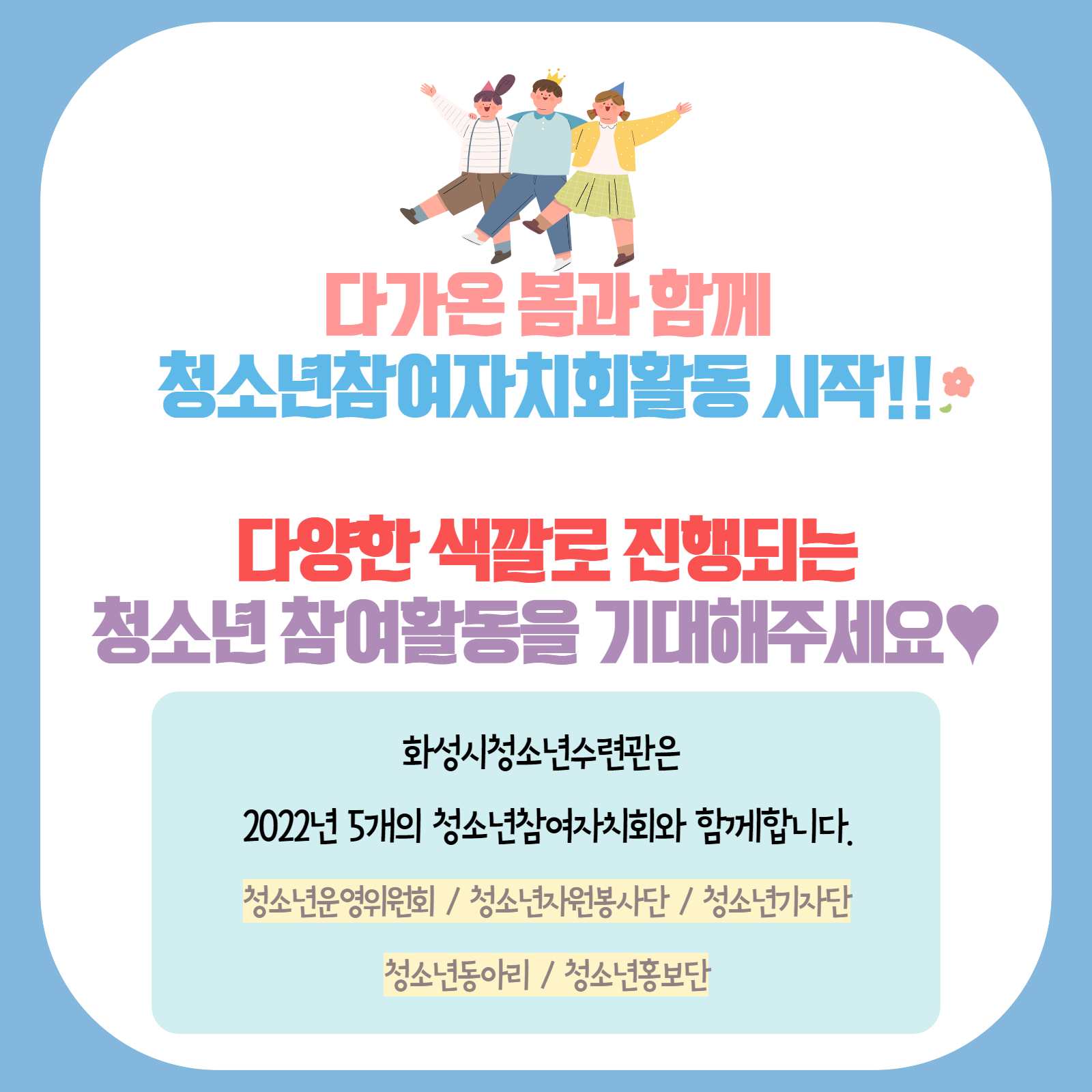 [화성시청소년수련관] 2022 청소년참여자치회 오리엔테이션(03.19.) 재단에 바랍니다 상세 운영센터 유앤아이센터 등록일 2022년 3월 21일 11시 35분 조회수 567 #화성시청소년수련관#청소년운영위원회#청소년자원봉사단#청소년기자단#오리엔테이션한걸음 다가온 봄3월 19일(토), 수련관 3개 참여자치회의 오리엔테이션이 진행되었습니다!설레는 첫만남의 현장, 카드뉴스로 함께 확인하세요^^ 목록보기