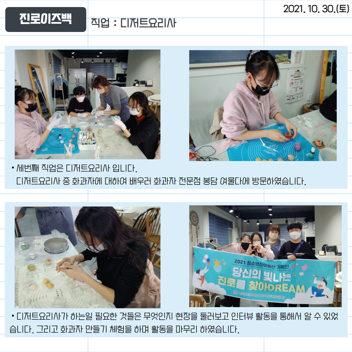 2차에서는 '화학연구원', '디저트요리사', '애니메이터', '제과제빵사' 직업에 대하여 인터뷰하고 체험활동을 진행했습니다.