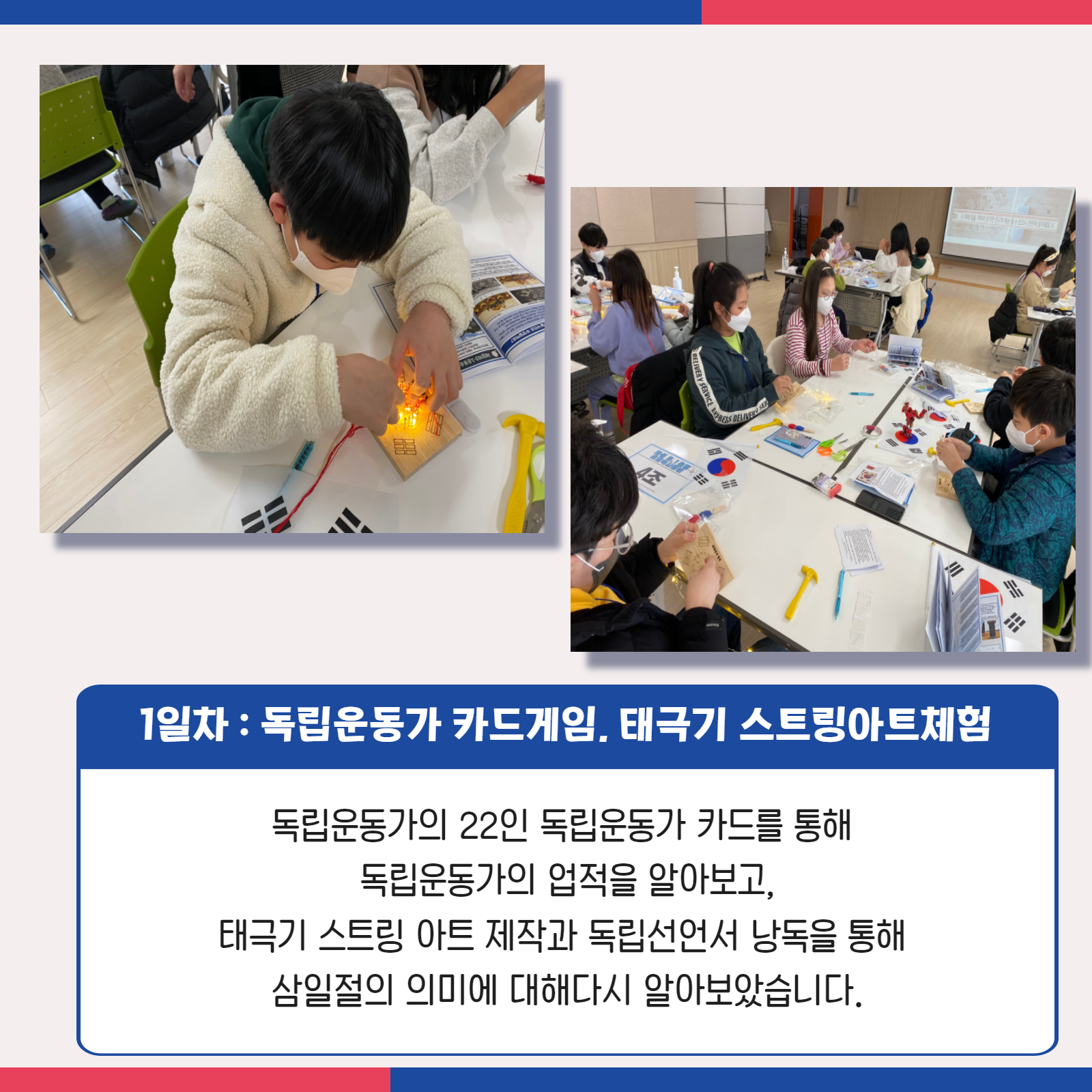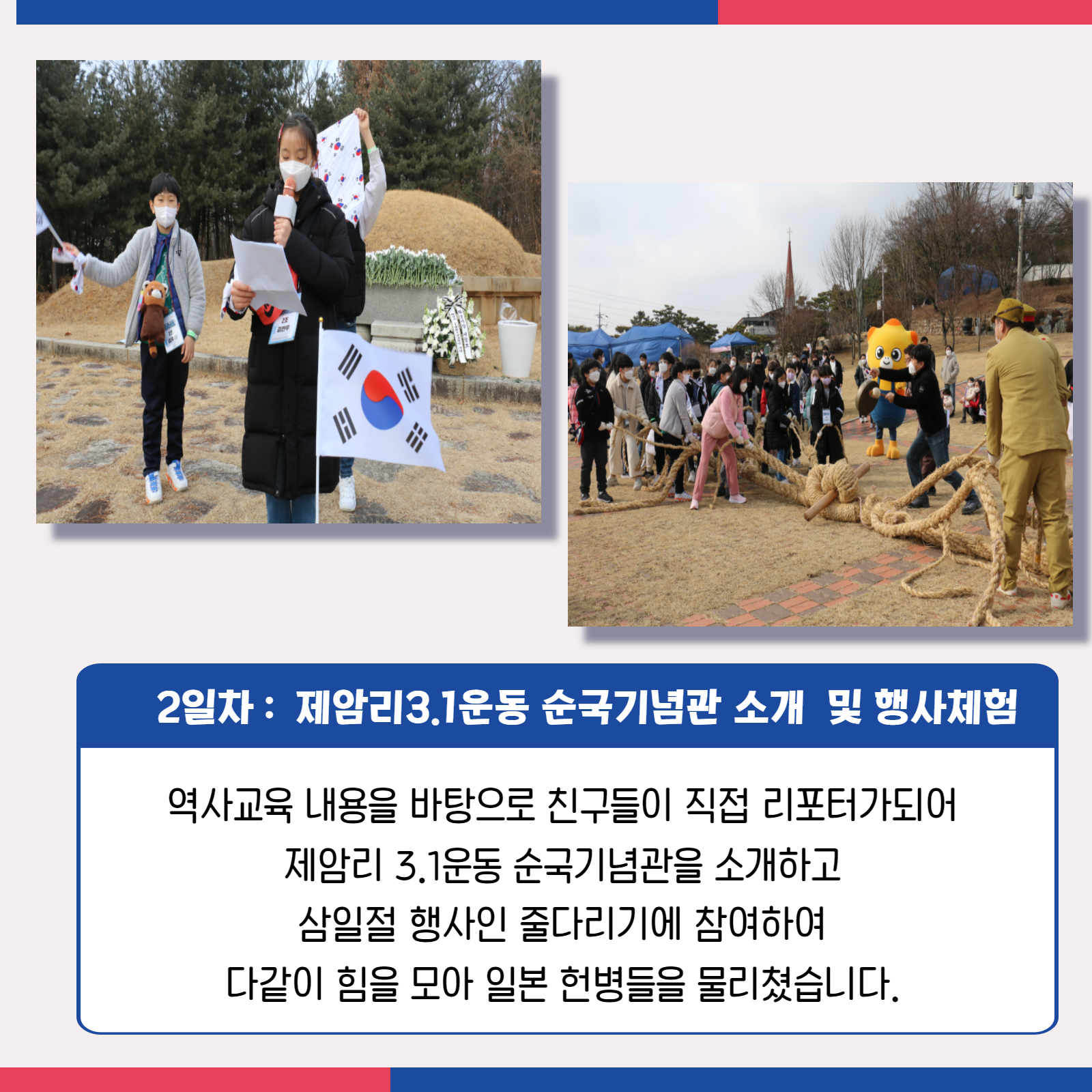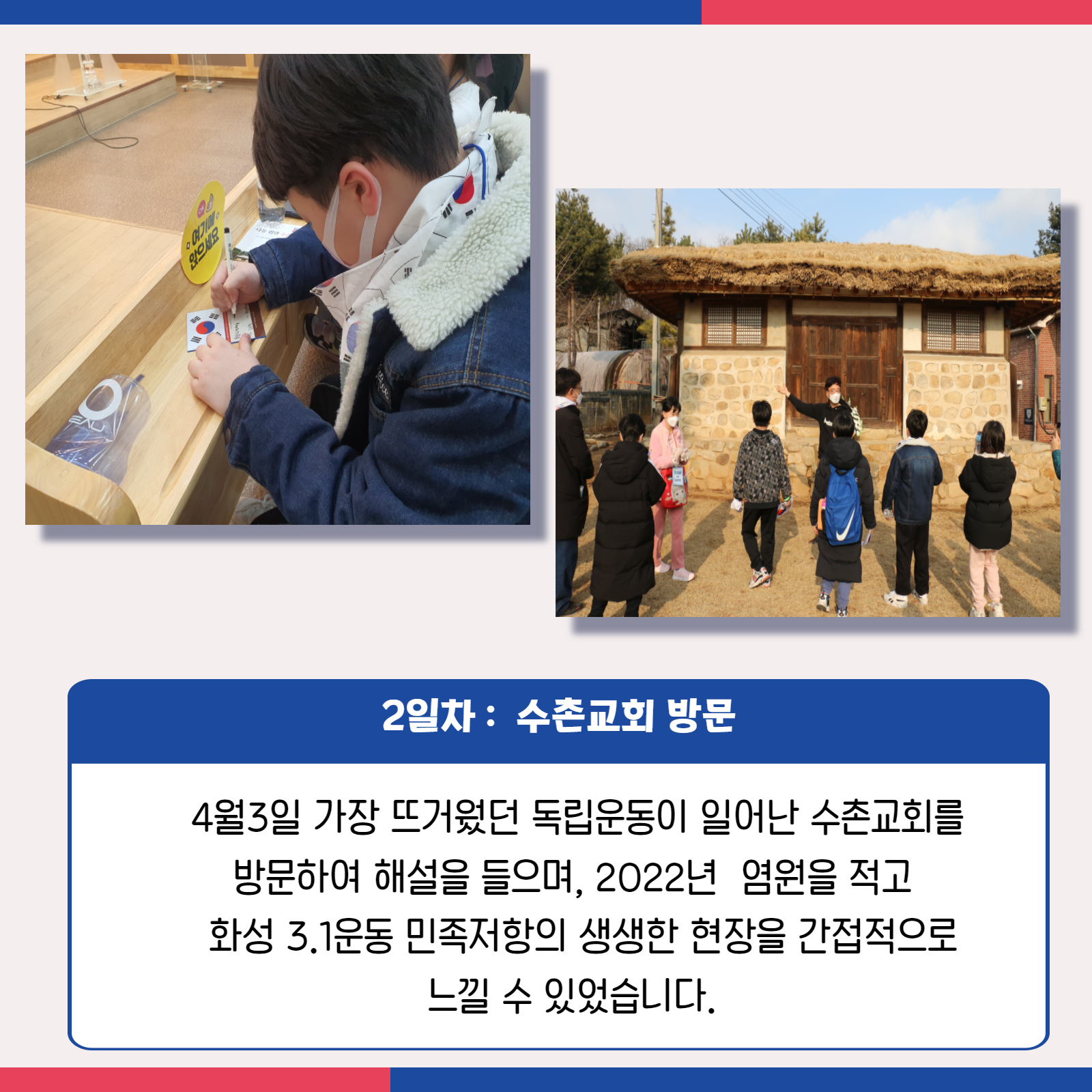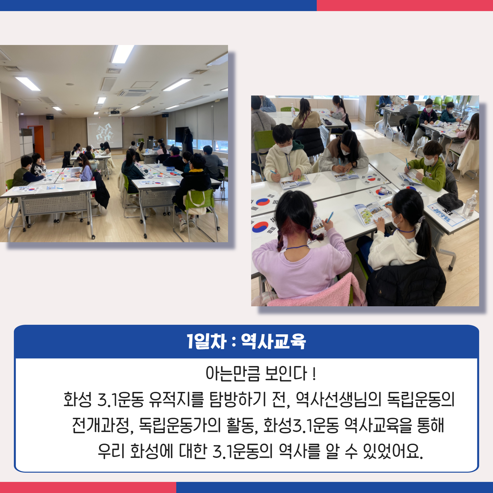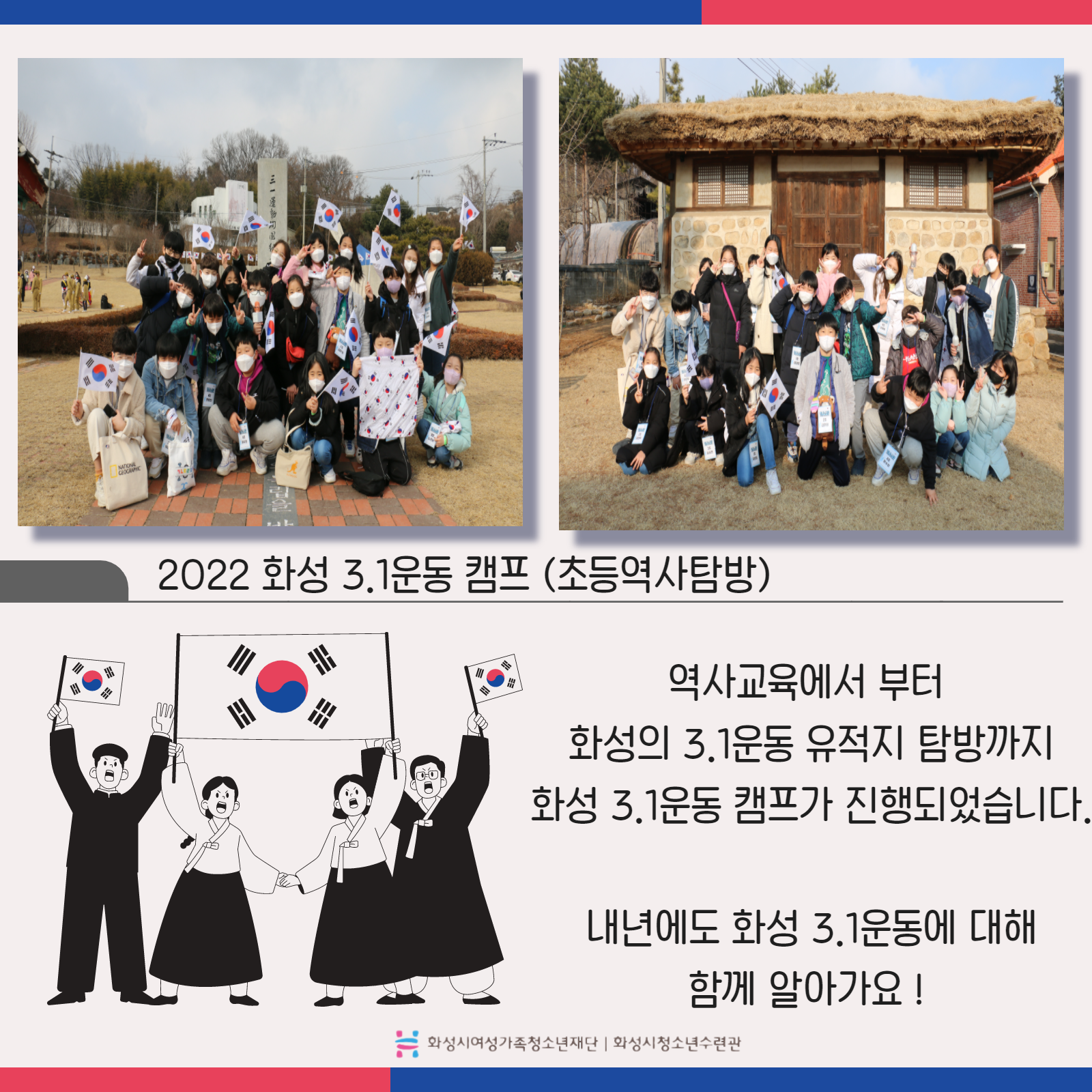[화성시청소년수련관] 2022 화성3.1운동 카드뉴스 재단에 바랍니다 상세 운영센터 유앤아이센터 등록일 2022년 3월 16일 9시 43분 조회수 619 #화성시청소년수련관#화성3.1운동#카드뉴스화성3.1운동 활동사진이 왔어요!!오랜만에 진행한 야외체험활동에 "우와, 버스 오랜만에 탄다!"라며 기뻐해준 참가 친구들의 기대속에 즐겁게 체험을 진행했습니다.자세한 내용 카드뉴스로 함께보아요^^#화성역사체험 #초등역사체험 #3.1운동 #청소년수련관 #화성시 #내년에 #또만나요 목록보기