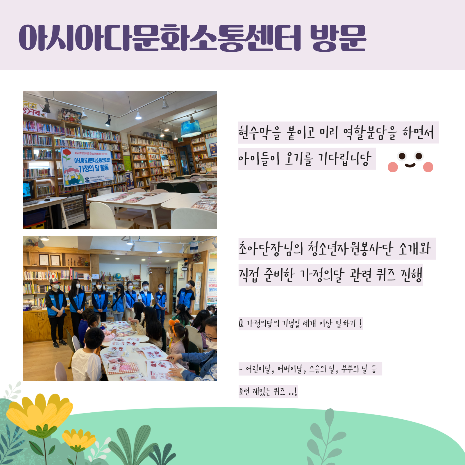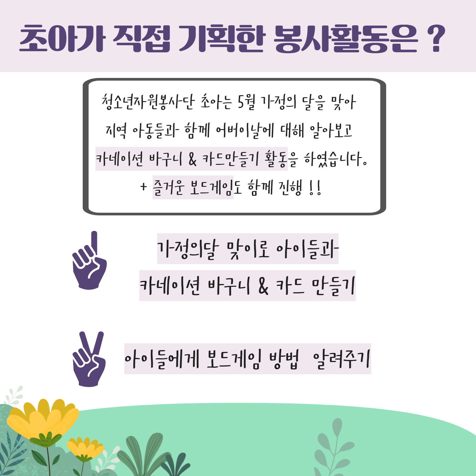 이번 5월 청소년자원봉사단은 가정의달을 맞아 지역아동들과 함께 어버이날에 대해 알아보고 카네이션 바구니 & 카드만들기와 보드게임 활동을 진행하였습니다.