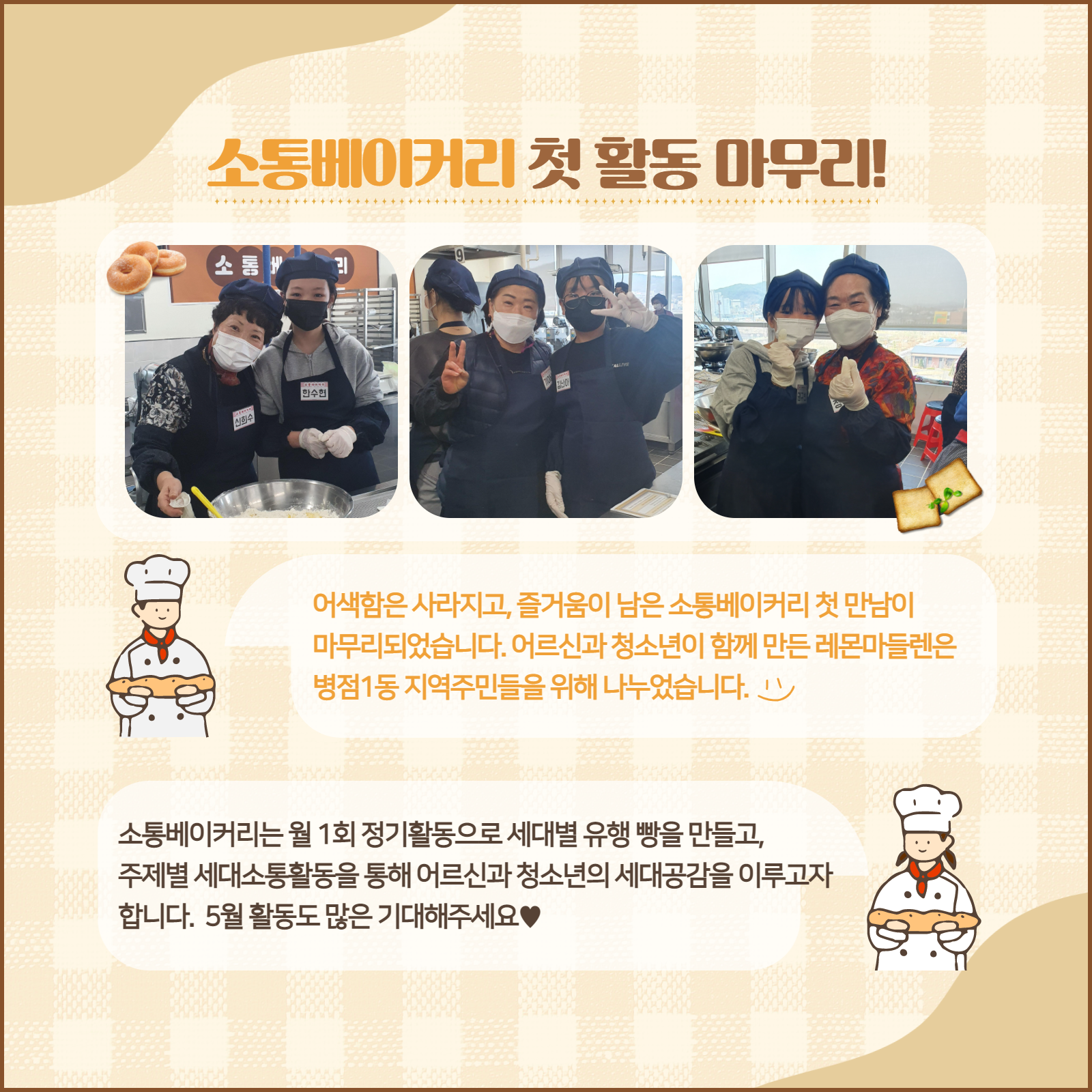 우리 동네 어르신과 청소년이 함께 만드는 빵 이야기 <소통베이커리>의 첫 활동이 4월 9일(토)에 진행되었습니다. 아침부터 수련관은 어르신과 청소년의 인사소리로 시끌벅적! 어색함은 활동지를 통한 인터뷰로 풀어지고, 레몬마들렌을 만들며 즐거운 시간이었습니다=) 자세한 활동모습은 카드뉴스로 함께 확인해요! *소통베이커리는 월1회 정기활동으로 어르신과 청소년의 세대공감을 이루는 프로그램입니다. *소통베이커리는 화성시청소년수련관과 병점1동 행복마을관리소가 함께합니다.