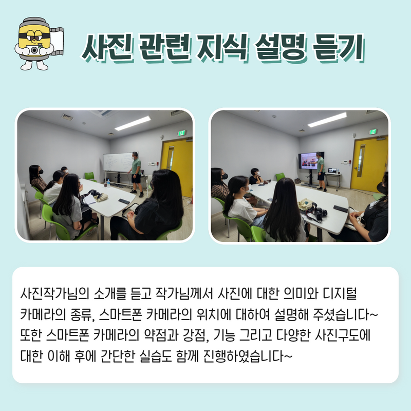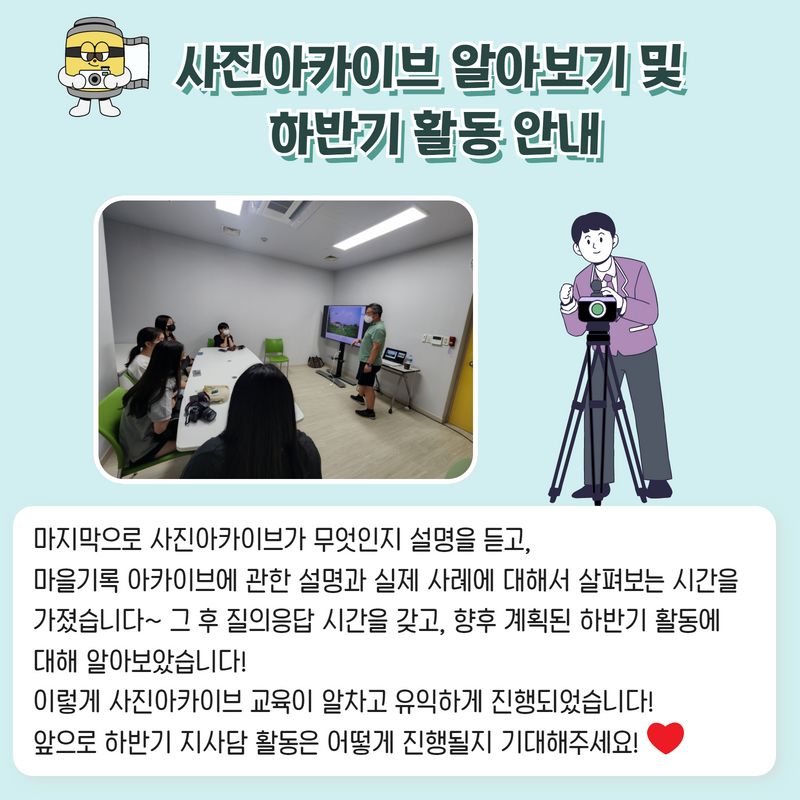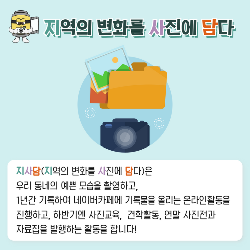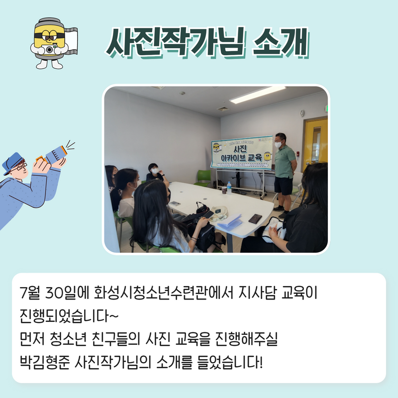 #화성시청소년수련관 #지사담 #지역의변화를사진에담다 #사진아카이브교육 7월 30일(토) 화성시청소년수련관 3층 동아리실2에서 지사담 사진아카이브교육이 진행되었습니다! 지사담(지역의 변화를 사진에 담다)은 우리 동네의 예쁜 모습을 촬영하고, 1년간 기록하여 네이버카페에 기록물을 올리는 온라인 활동을 진행하고, 하반기엔 사진교육, 견학활동, 연말 사진전과 자료집을 발행하는 활동을 합니다! 그럼 지사담의 사진아카이브 교육 현장을 카드뉴스로 만나보시죠! |