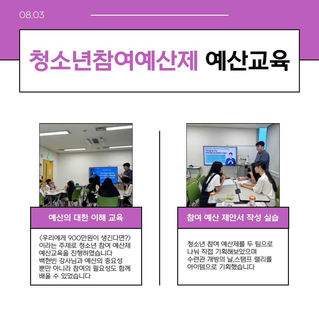 안녕하세요?? 수련관의 꽃, Youth Rising 16기 입니다 저희 청운위는 <우리에게 900만원이 생긴다면?> 이라는 주제로 청소년 참여 예산제 예산 관련 퍼실리테이션 교육을 받았습니다 또 두 팀으로 나눠 직접 참여 예산 제안서 작성 실습을 하며 여러가지 아이디어들을 도출하였습니다 이 아이디어들을 종합하여 청소년 참여 예산제를 진행 할 예정입니다 더불어 8월 7일에 있을 기관장 간담회의 PPT를 위원님들과 공유해 피드백을 받고 더 완성도 있는 PPT를 완성하였으며 기관장 간담회에서 각자의 역할을 정하며 청운위 위원님들 모두가 참여 할 수 있도록 하였습니다 이번 상반기 기관장 간담회를 통해 화성시청소년수련관을 더 쾌적하고 안전한 공간으로 만들 수 있도록 노력하겠습니다 이후 8월에는 상반기 기관장 간담회와 타기관과의 교류활동이 있을 예정입니다 앞으로 화성시청소년운영위원회가 만들어나갈 화성시청소년수련관의 모습! 많은 기대 부탁드립니다 ?? 작성자: 민선하 위원님 |