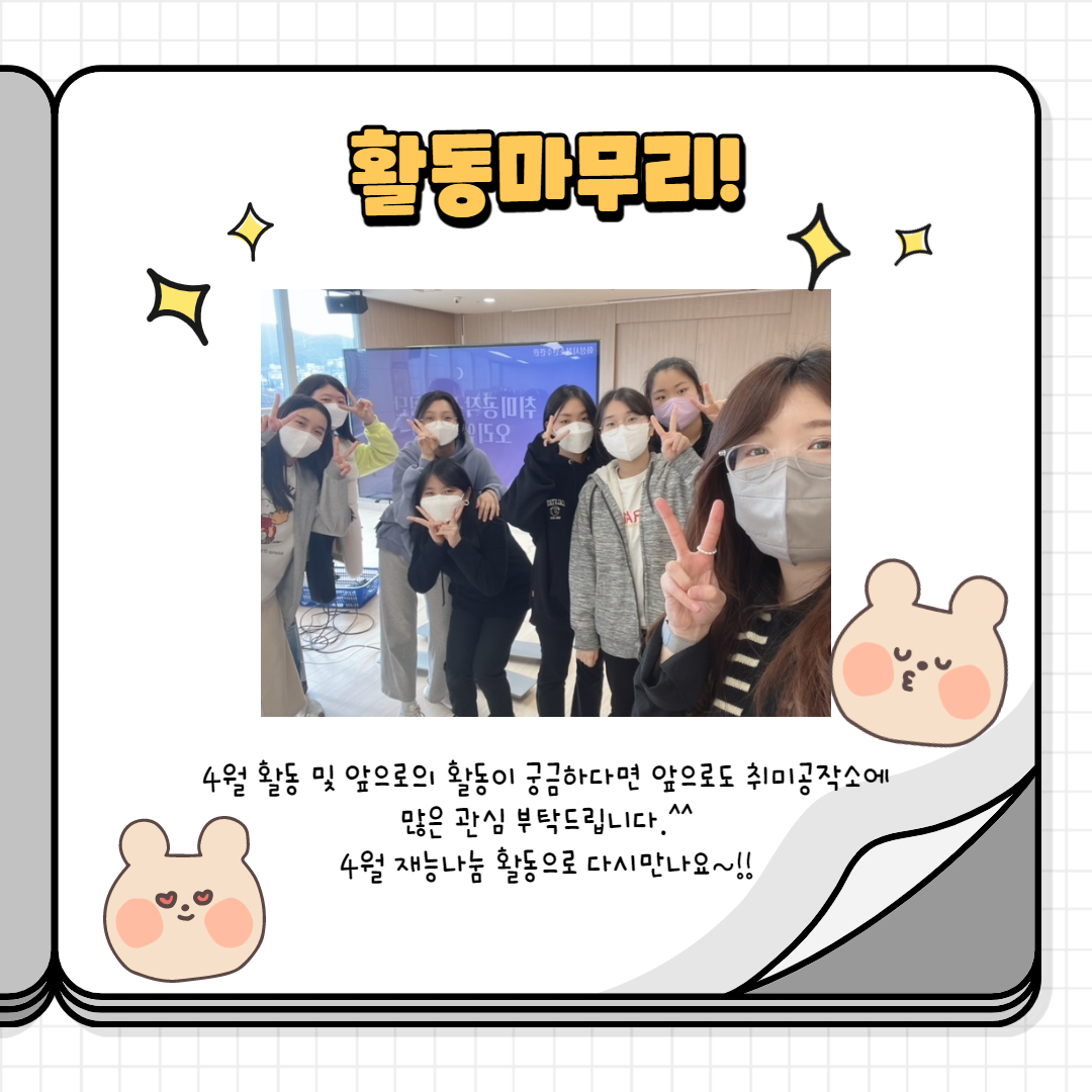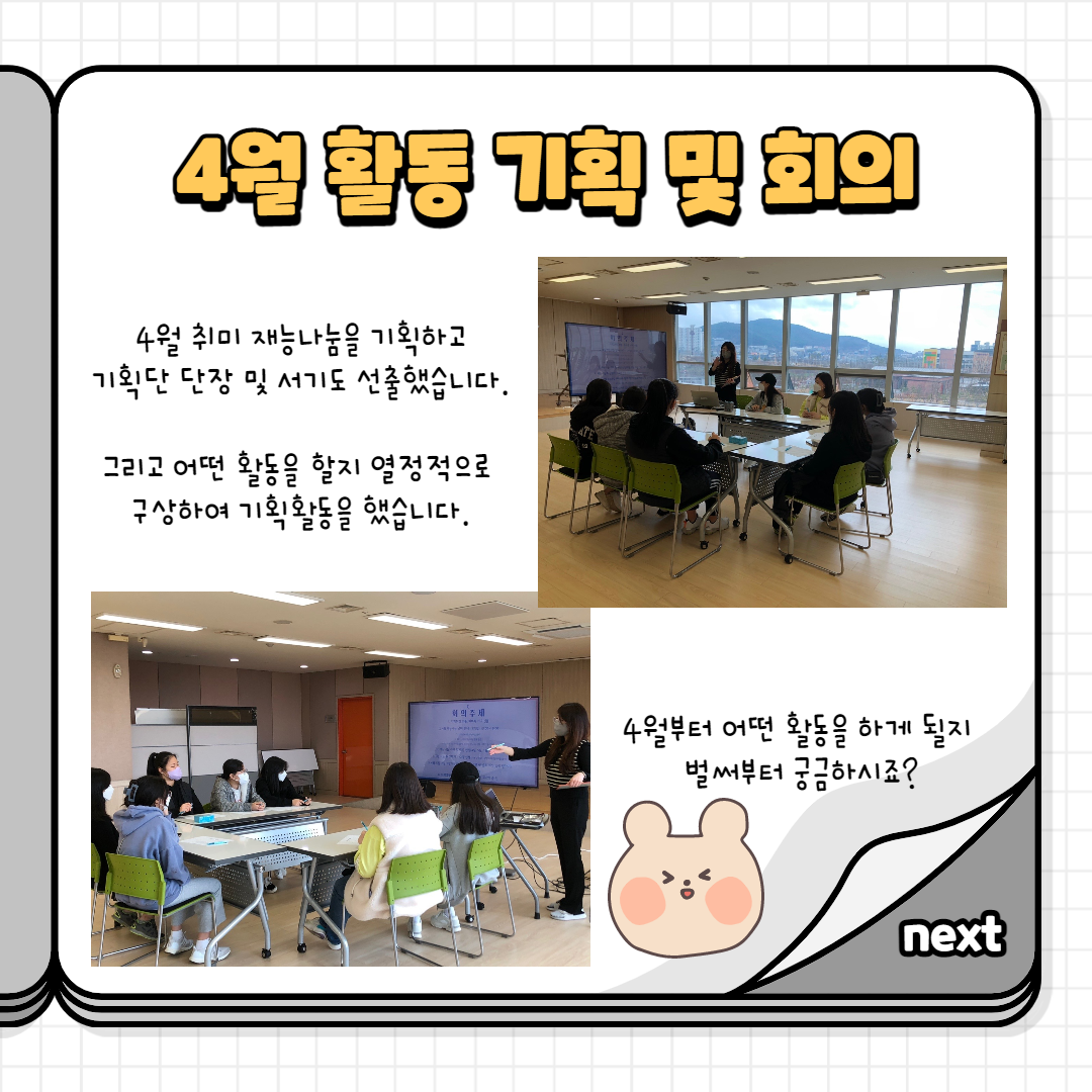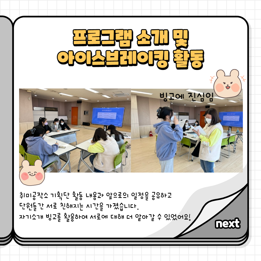 [화성시청소년수련관] 2022 취미공작소 기획단 오리엔테이션 운영!! 재단에 바랍니다 상세 운영센터 유앤아이센터 등록일 2022년 3월 30일 17시 33분 조회수 571 안녕하세요? 화성시청소년수련관입니다. 2022년 03.26.(토)에 취미공작소 기획단 첫 모임인 오리엔테이션을 진행하였습니다! 기획단 친구들과의 첫만남 모습을 함께 카드뉴스로 만나보시죠^^ 목록보기