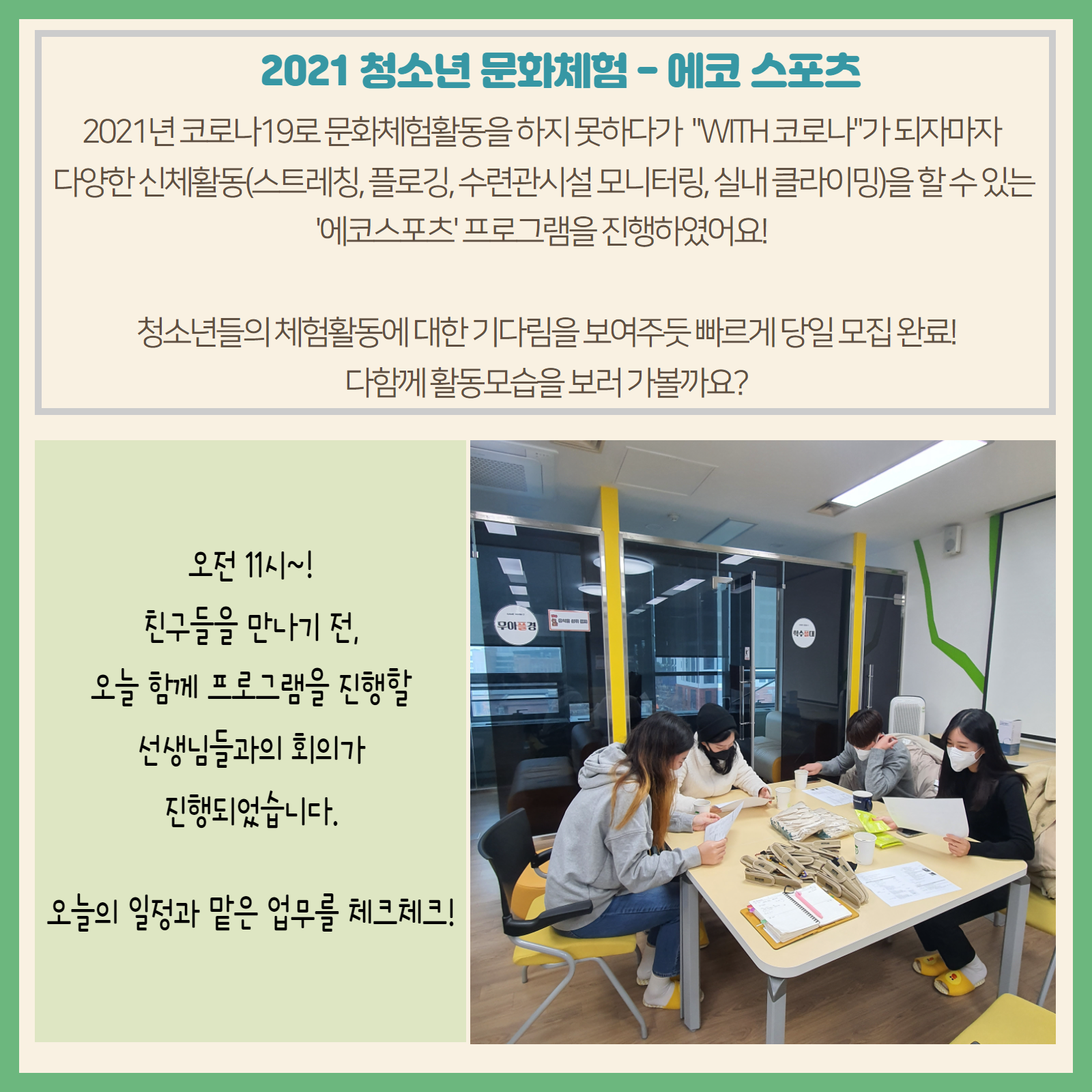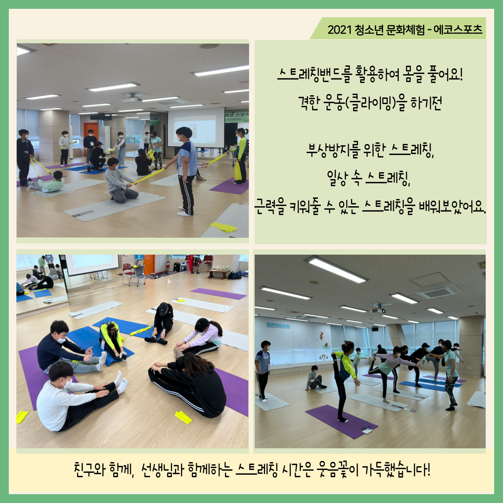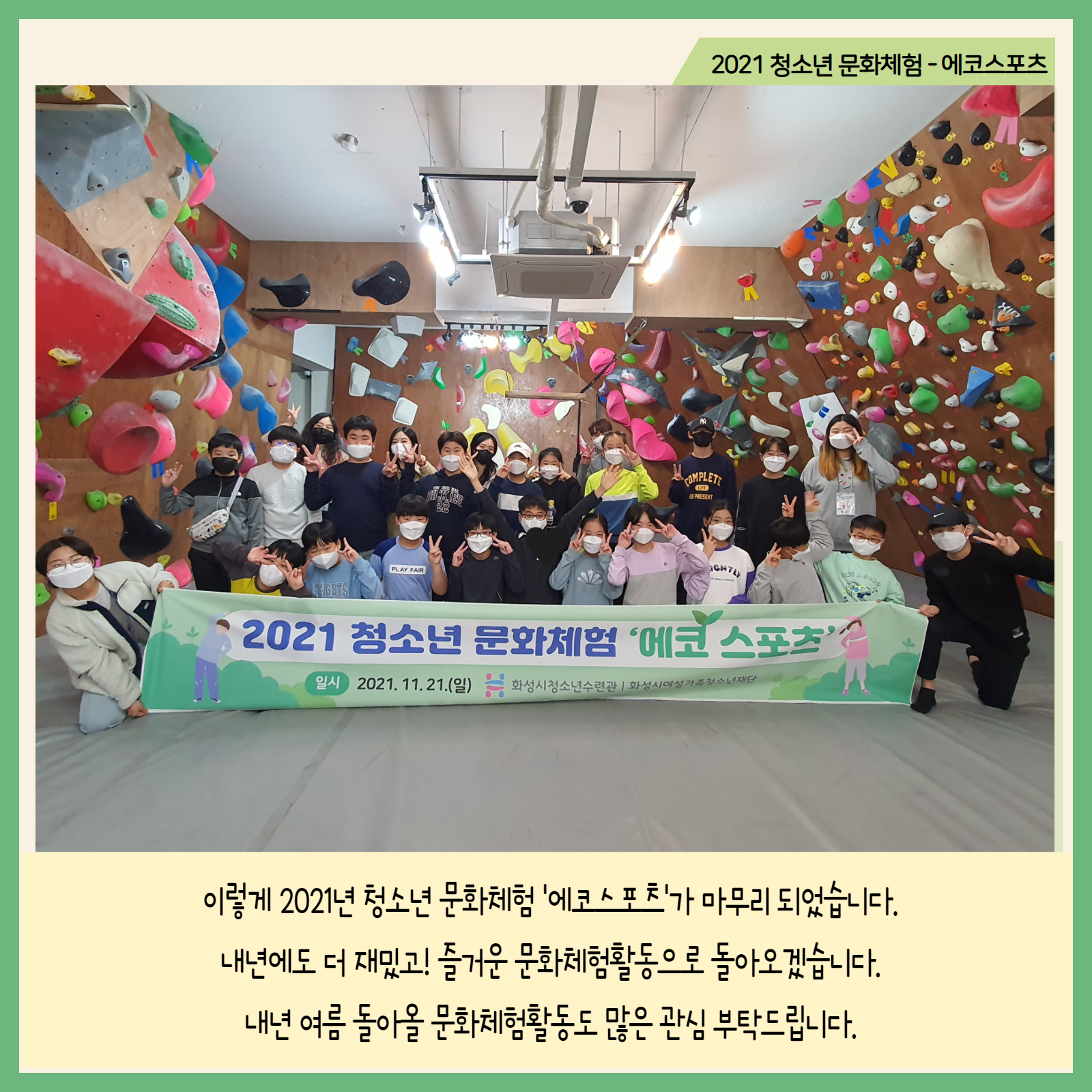 #화성시청소년수련관 #청소년문화체험 #에코스포츠 #실내클라이밍 #플로깅 #스트레칭 2021 청소년문화체험 '에코스포츠' 다양한 신체활동을 할 수 있는 체험활동이 진행되었습니다. 즐겁고 활기찼던 그날의 모습, 카드뉴스로 함께보아요=) #청소년체험 #수련관으로놀러와 |