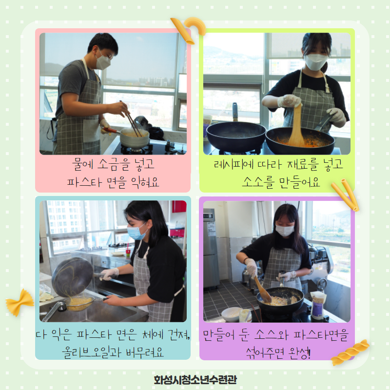 [화성시청소년수련관] 청소년취미공작소 기획단 9월 정기활동 재단에 바랍니다 상세 운영센터 유앤아이센터 등록일 2021년 9월 28일 19시 13분 조회수 668 #화성시청소년수련관#취미공작소#청소년취미공작소#기획단정기활동#요리9월 12일 일요일, 청소년취미공작소 기획단 친구들의 9월 정기활동이 운영되었습니다.9월 취미활동의 주인공은 기획단 "김나경" 친구 였는데요, 나경이의 취미를 함께한 취미공작소 친구들!카드뉴스로 함께 보아요^^#파스타 #요리 #취미 #청소년여가 #청소년요리 #요리체험 목록보기