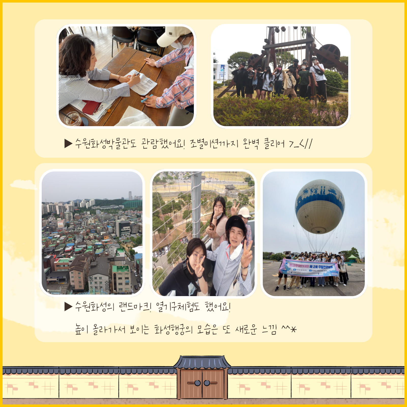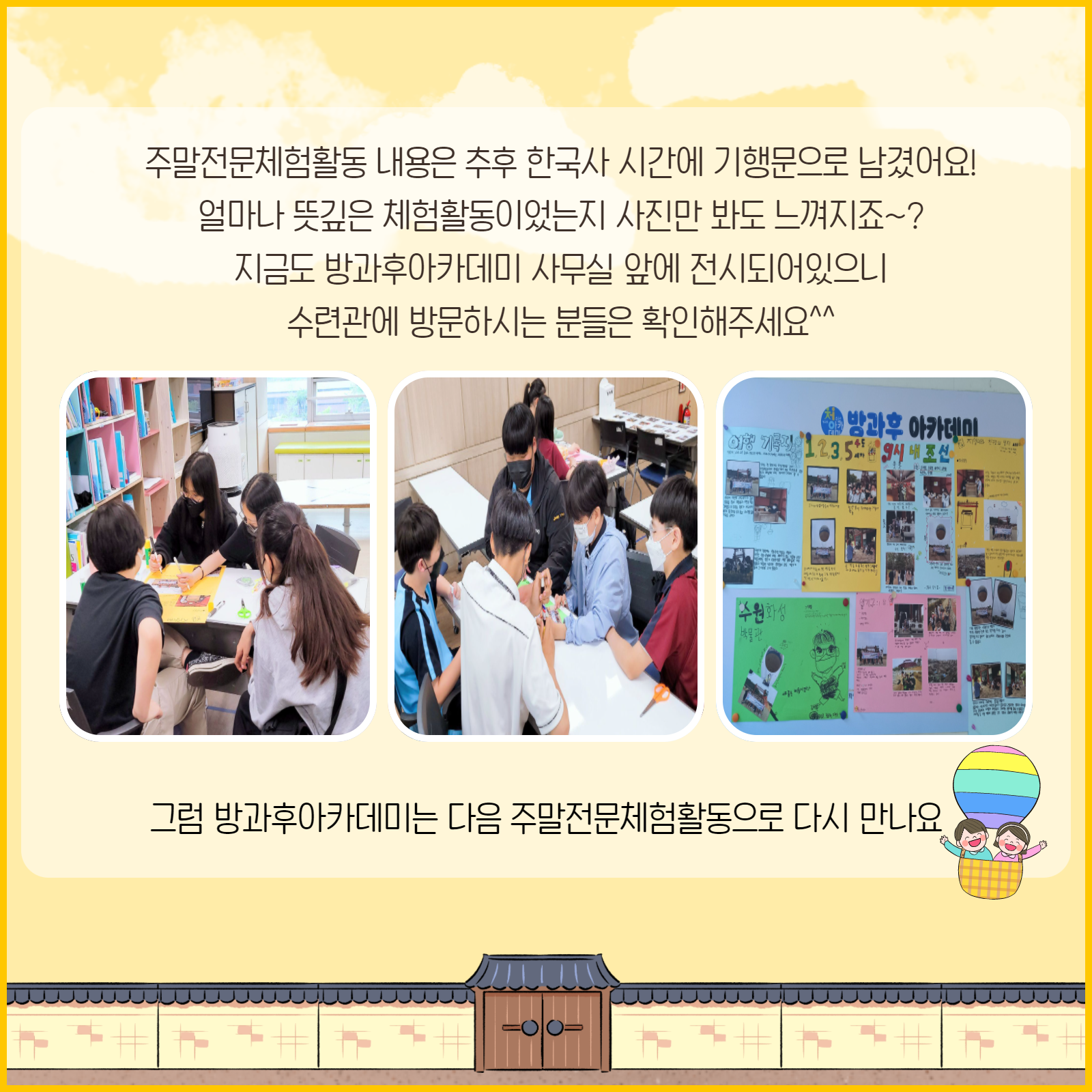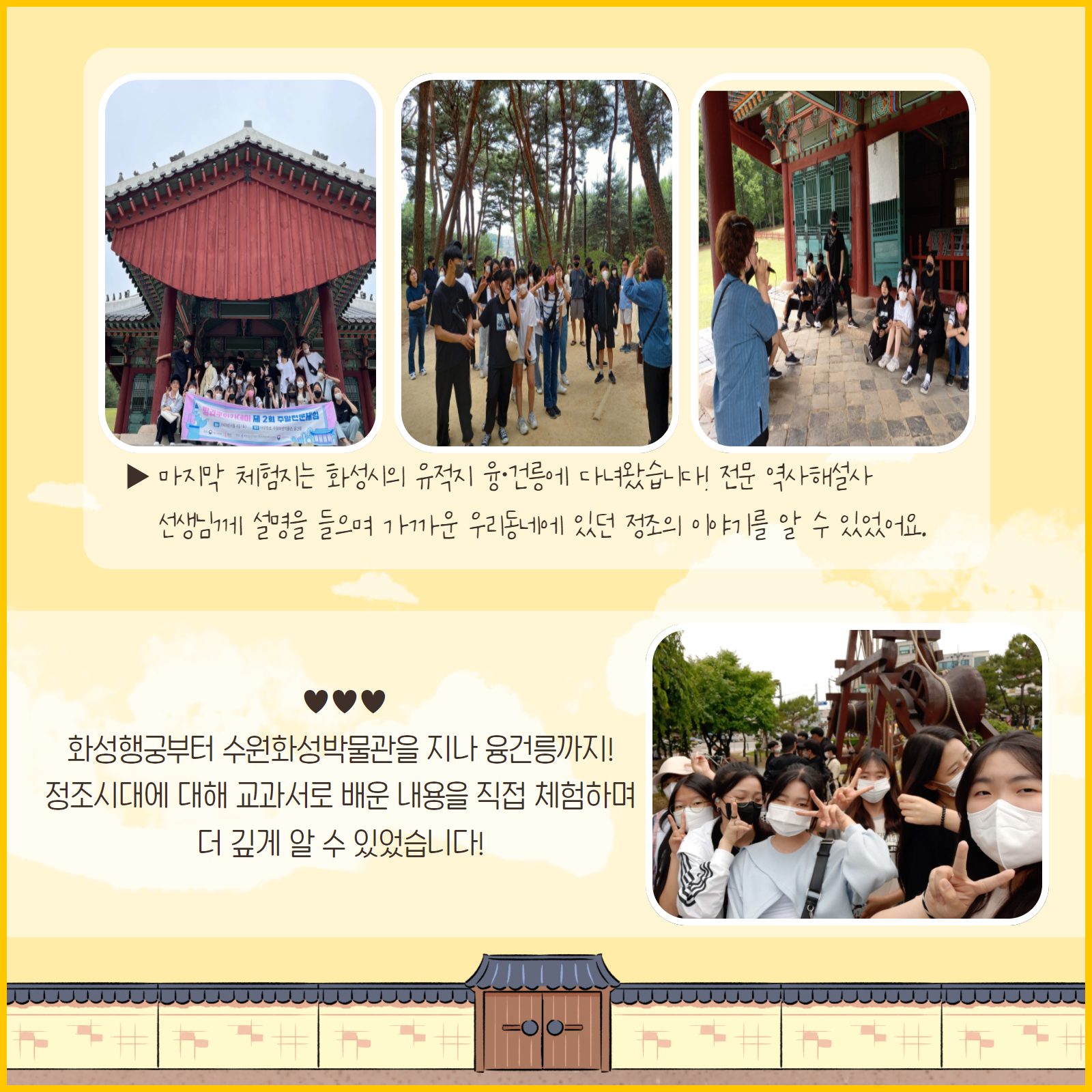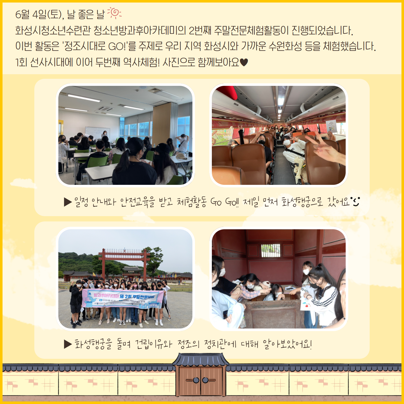 [화성시청소년수련관] 청소년방과후아카데미 2차 주말전문체험활동 "정조시대로 GO!" 재단에 바랍니다 상세 운영센터 유앤아이센터 등록일 2022년 6월 21일 15시 17분 조회수 629 #화성시청소년수련관#청소년방과후아카데미#주말전문체험활동화성시청소년수련관의 청소년방과후아카데미 친구들이 6월 4일(토), 두번째 주말전문체험활동을 다녀왔습니다!첫번째에 이어 두번째 역사체험활동 주제는 "정조시대로 GO!" 였습니다.화성행궁과 융건릉 등 정조시대에 대해 체험하는 소중한 시간이었다고 하네요!자세한 내용은 카드뉴스로 함께보아요♡#역사체험 #체험활동 #화성시 #청소년 #수련관 #화성가볼만한곳 #융건릉 #화성행궁 #열기구체험 목록보기