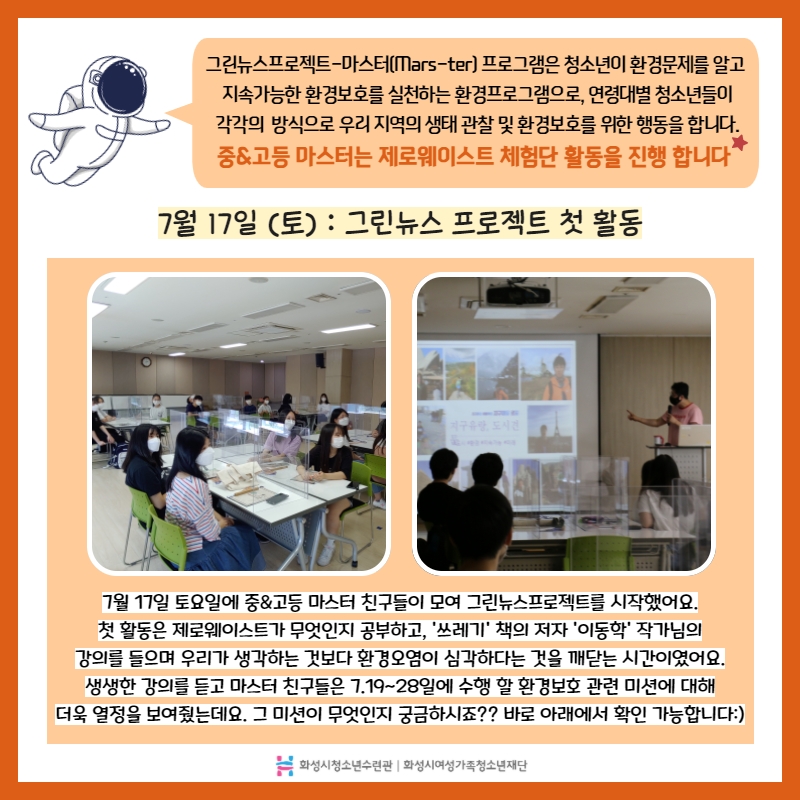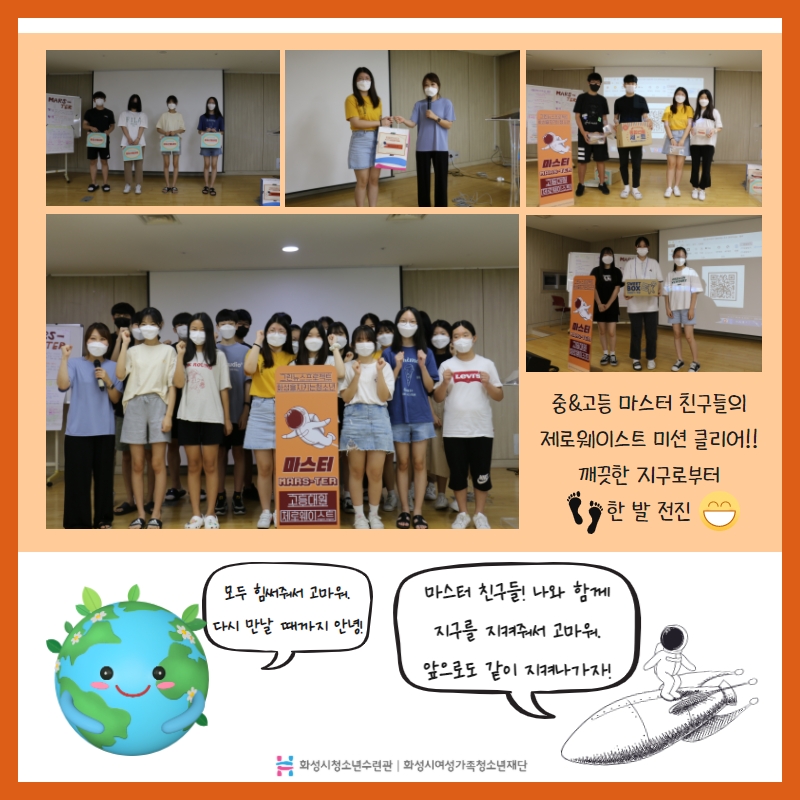 7월 17일(토)~7월 31(토), 화성을 지키는 청소년 '마스터(mars-ter)' 를 진행했습니다. 이번에는 중&고등 마스터 친구들이 모여 제로웨이스트 체험단 활동을 했습니다. 마스터 친구들이 모여 어떻게 활동을 진행했는지 궁금하시다면 아래에 카드뉴스를 참고해주세요♥ |