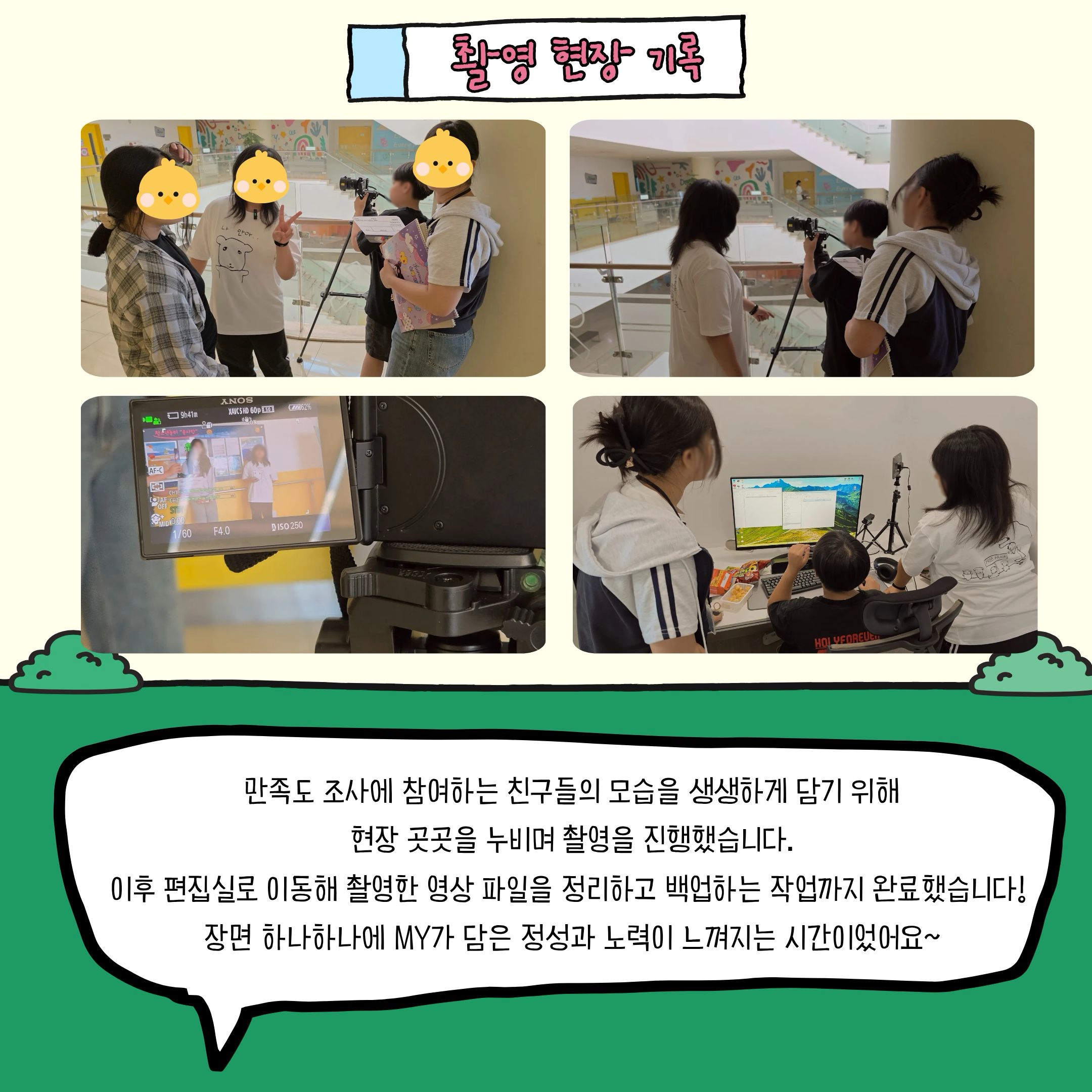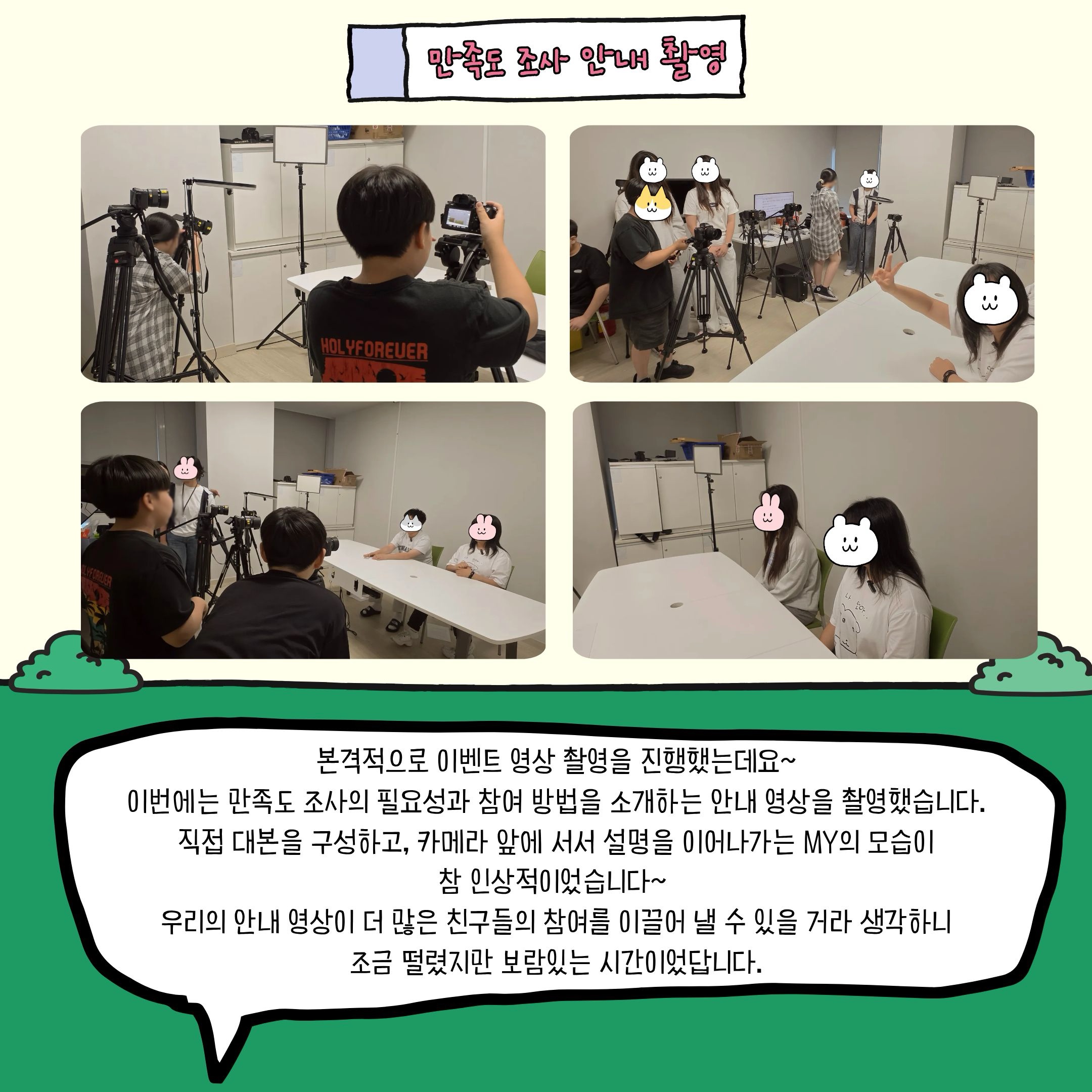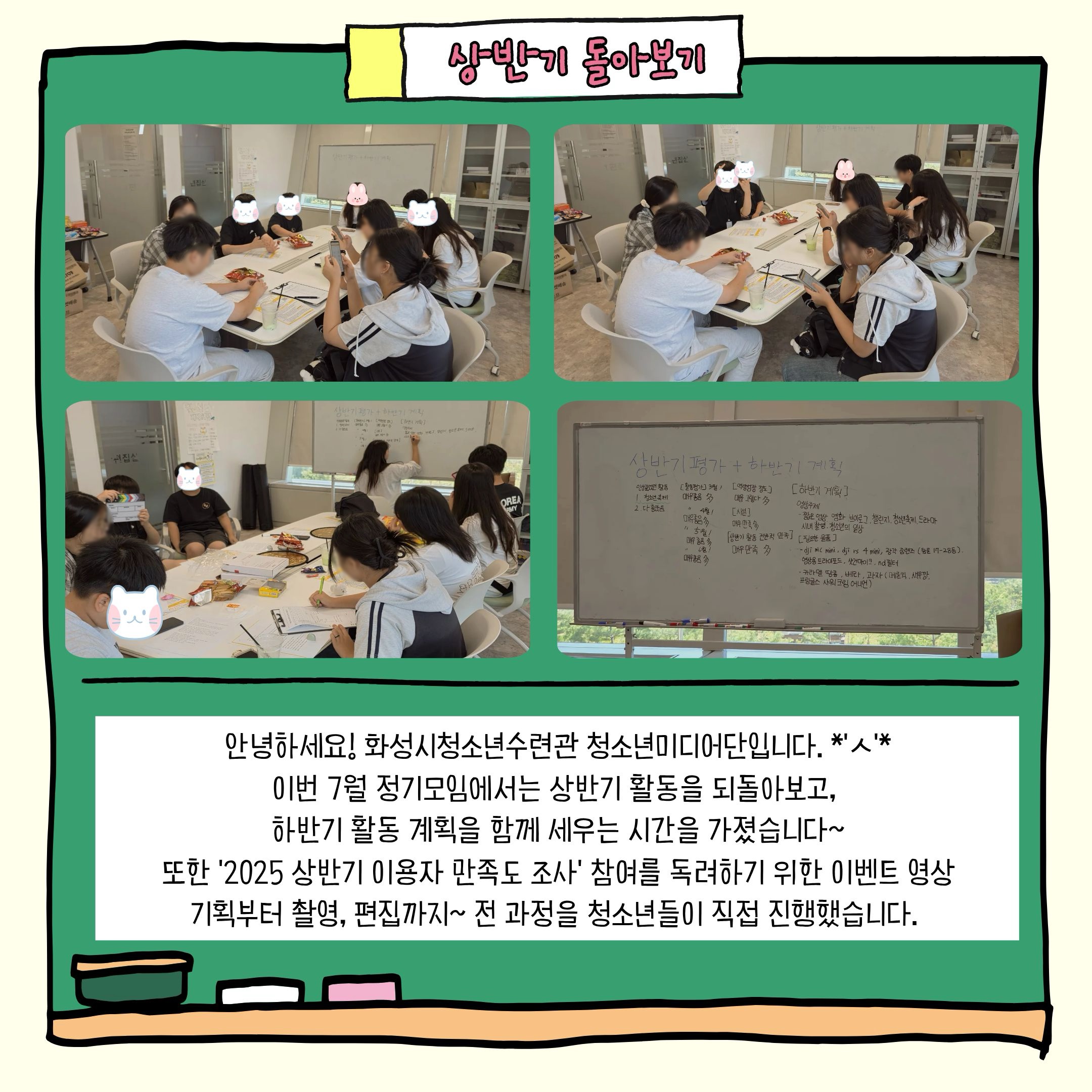 7월 정기 모임에서는 상반기 활동을 돌아보고 하반기 활동 계획을 함께 세우는 시간을 가졌습니다. 또한 '2025 상반기 이용자 만족도 조사' 참여를 독려하기 위해 이벤트 영상을 직접 기획하고 촬영·편집하였습니다.