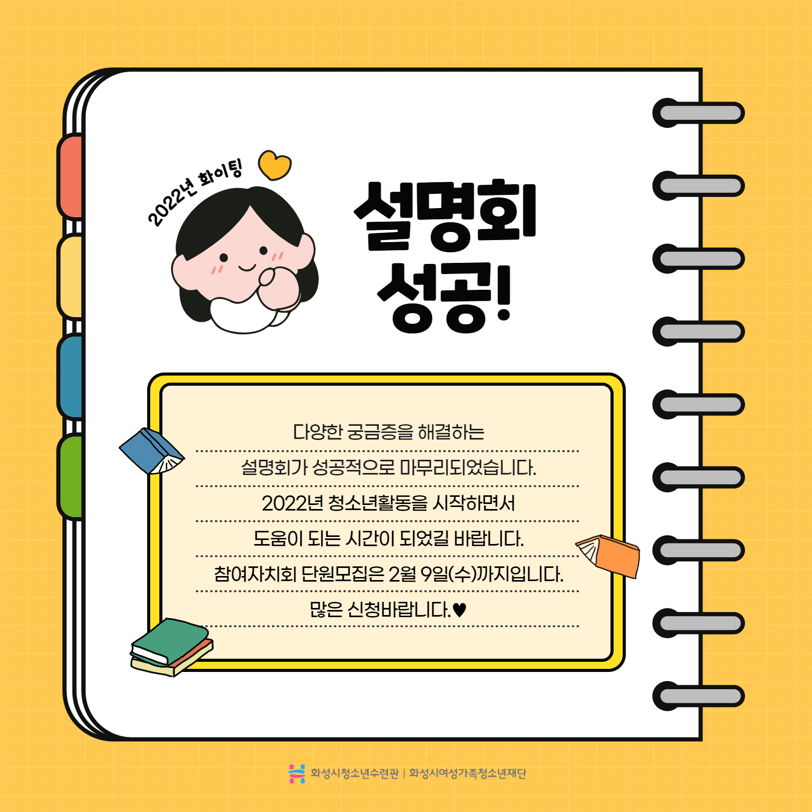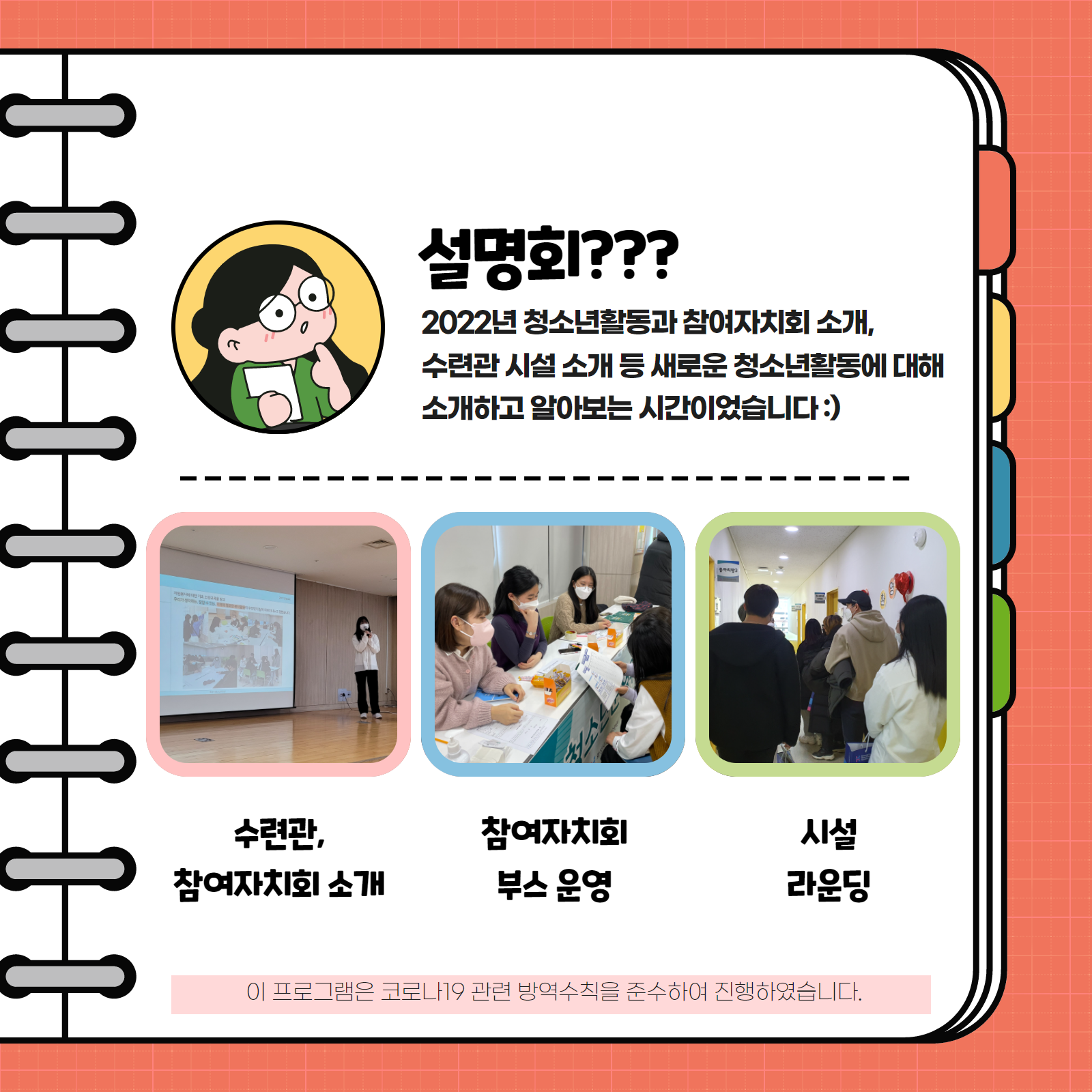 [화성시청소년수련관] 2022 청소년참여자치회 설명회 재단에 바랍니다 상세 운영센터 유앤아이센터 등록일 2022년 2월 5일 17시 11분 조회수 672 드.디.어. 설명회 D-day!!!세미나실에 오랜만에 청소년 친구들이 모였습니다 ^^2022년 새로운 참여자치회와 청소년활동들, 수련관 라운딩 등 알찬 구성으로 즐거운 시간이었습니다>_<참여자치회 접수는 2월 9일(토)까지 입니다.많은 신청바랍니다.♥ 목록보기