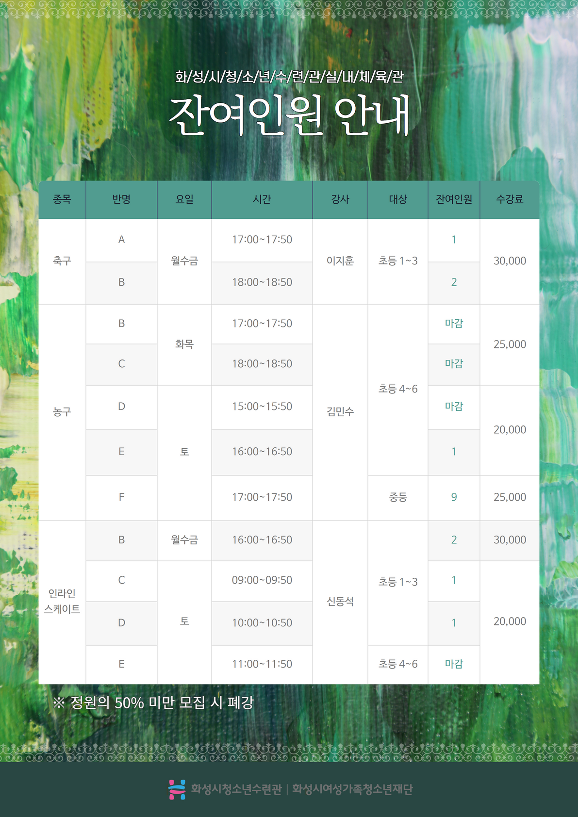 | 제목 | [화성시청소년수련관] 9월 실내체육관 신규 및 추가모집 잔여인원 안내 (8. 24. 14:00 기준) | ||