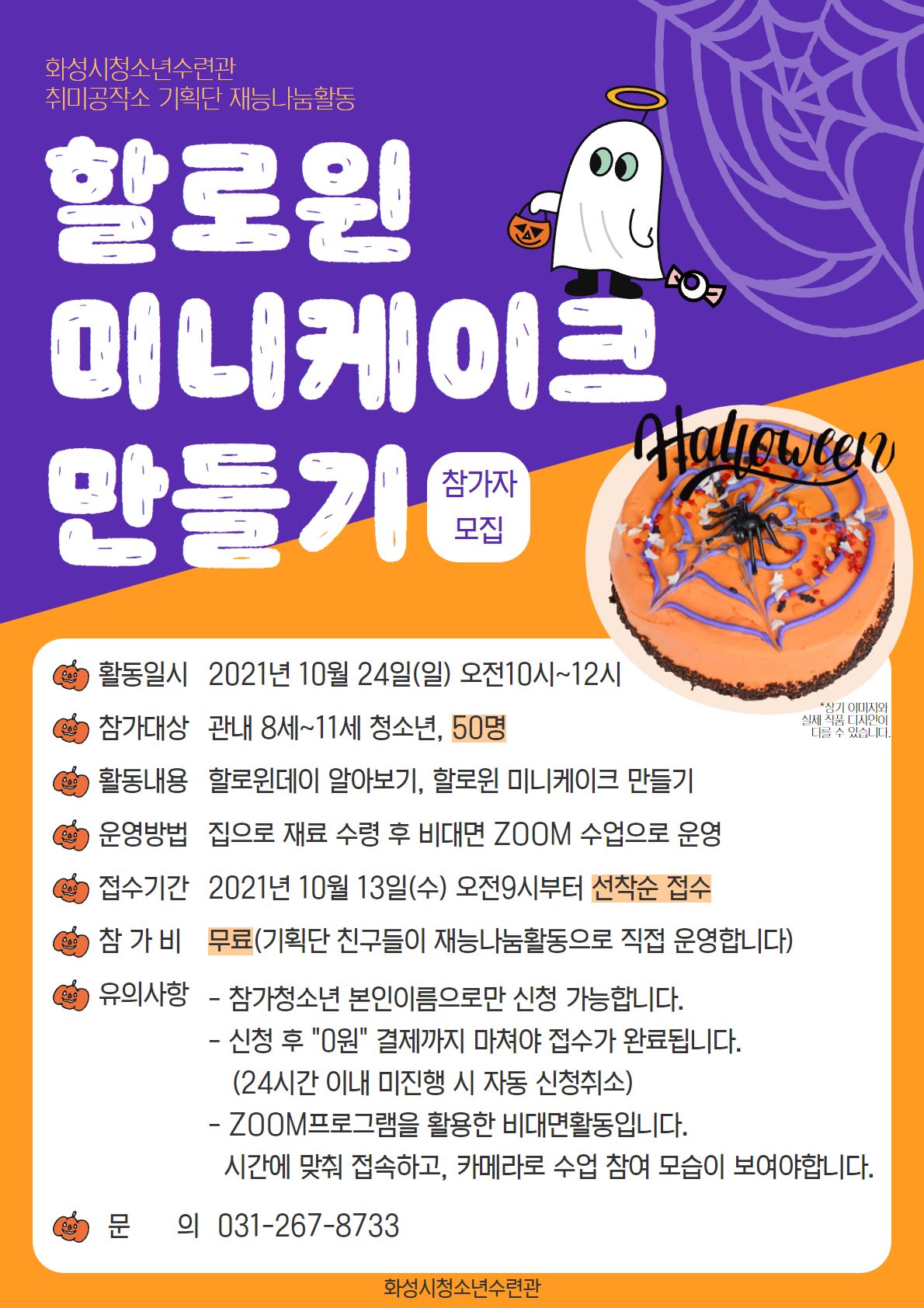 청소년취미공작소 기획단 재능나눔활동 "10월 원데이취미클래스" 참가자모집!! 1. 활동내용 ○ 할로윈데이 알아보기, 할로윈 미니케이크 만들기