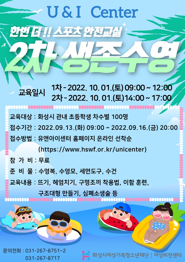 제목 [유앤아이센터] 스포츠 안전교실 '생존수영' 참가자 모집 운영센터 유앤아이센터 작성일 2022년 8월 19일 17시 40분 조회수 2,067 첨부 파일 아이콘2차 생존수영.jpg (358.43KB)다운로드 아이콘 목록보기