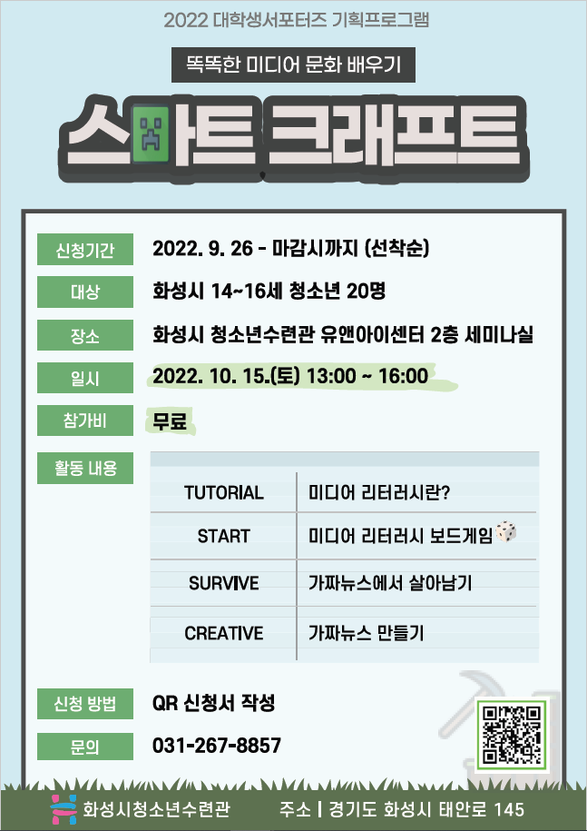 제목 [화성시청소년수련관] ★스마트크래프트(똑똑한 미디어 문화 배우기) 참가자를 모집합니다★
