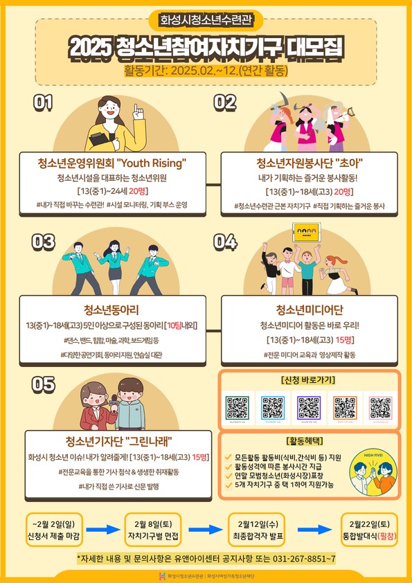 제목 [화성시청소년수련관] 2025 청소년참여자치기구(운영위원회,봉사단,동아리,미디어단,기자단)참가청소년 모집