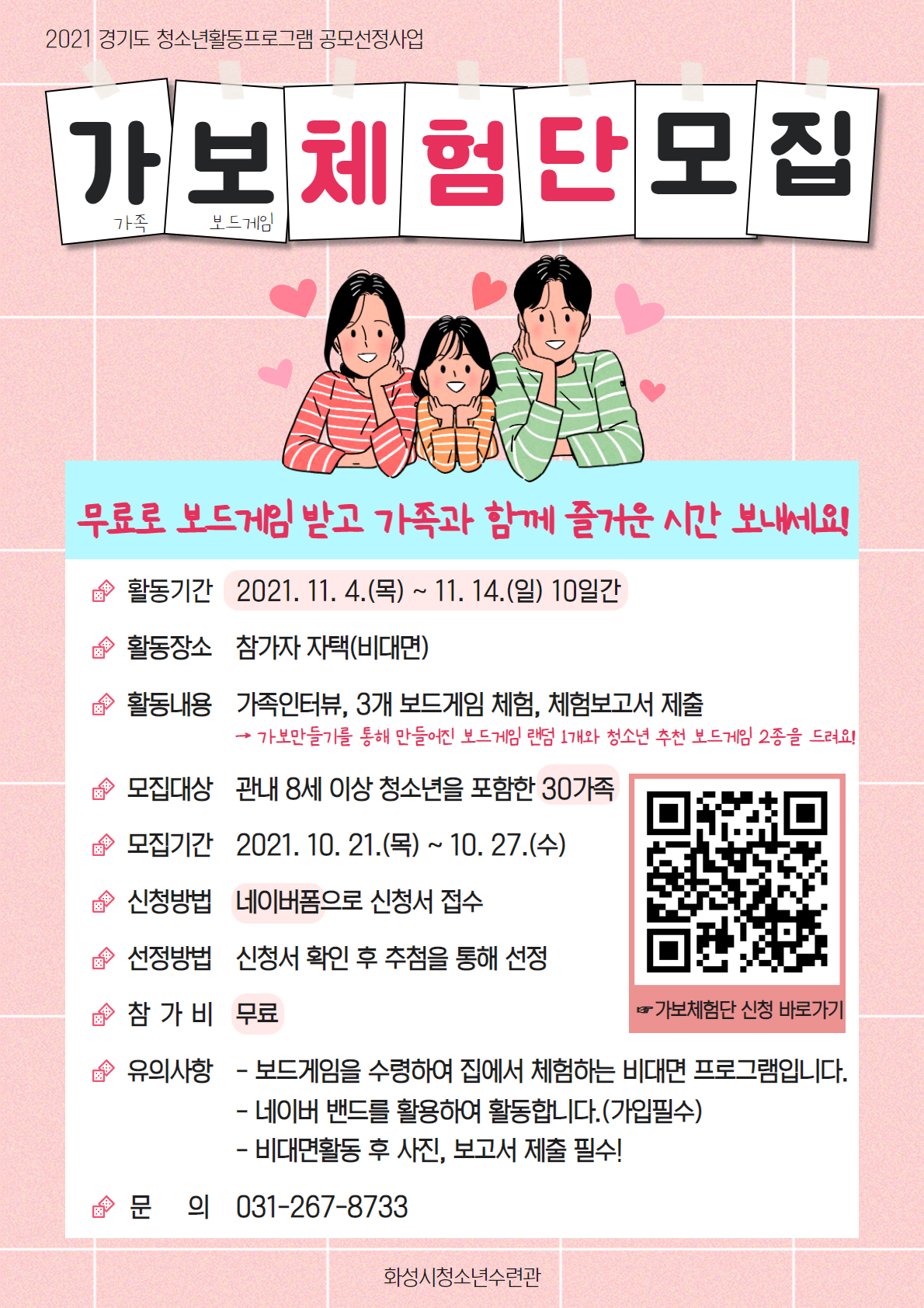 제목 [화성시청소년수련관] 가보체험단을 모집합니다!! 운영센터 유앤아이센터 작성일 2021년 10월 21일 21시 11분 조회수 1,405 2021 경기도청소년활동프로그램 공모사업 ? "가족보드게임만들기-가보만들기"에서★★★가보체험단을 모집합니다★★★ 무료로 보드게임도 받고, 가족과 즐거운 시간 보내세요^^ 신청서 링크 : http://naver.me/xyUrDabC ?? 목록보기