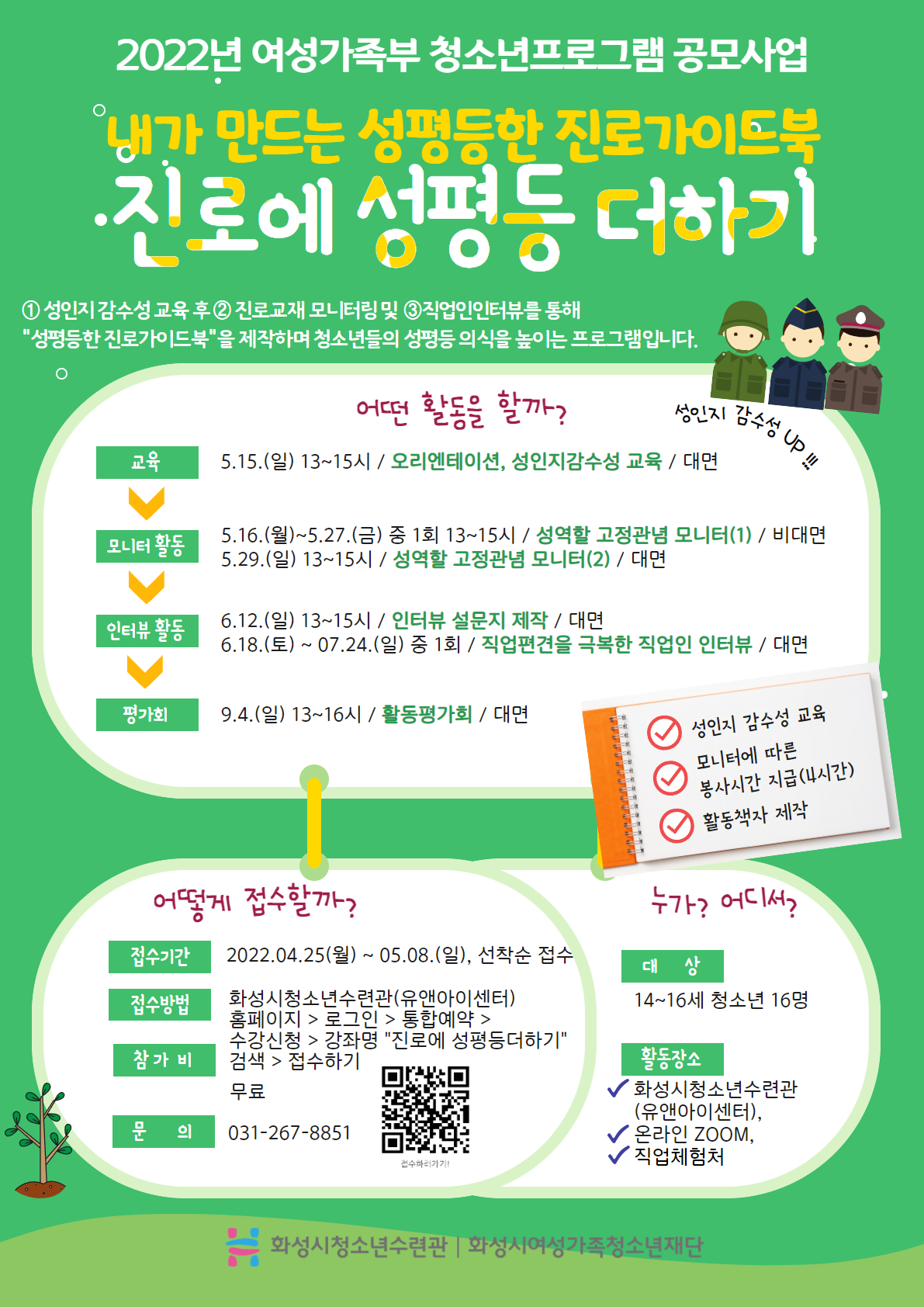 제목 2022년 여성가족부 청소년 공모사업 "진로에 성평등 더하기" 참가 청소년 모집 운영센터 유앤아이센터 작성일 2022년 4월 20일 18시 5분 조회수 2,661 첨부 파일 아이콘공모사업 참가자모집 (2).png (368.67KB)다운로드 아이콘 목록보기