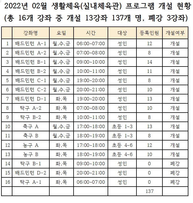 | 제목 | 2022년 02월 생활체육(실내체육관) 프로그램 개강 안내 | ||