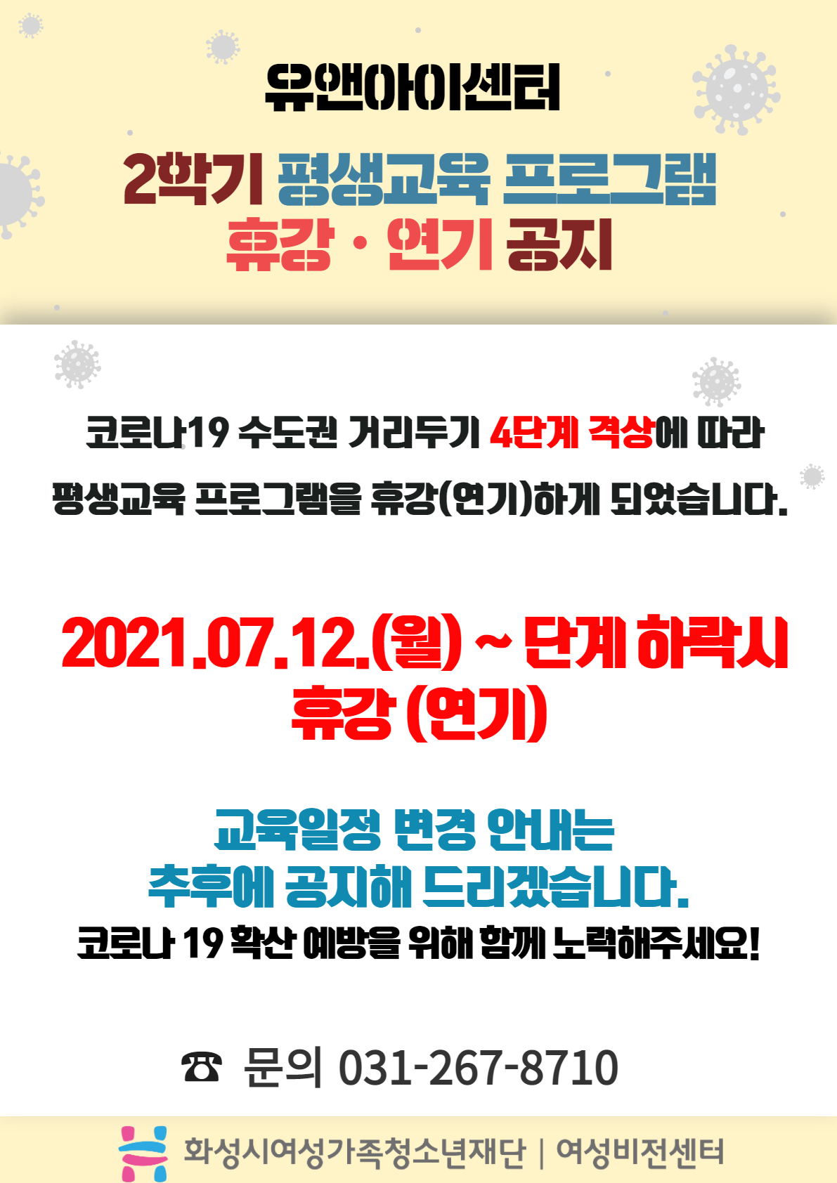 제목 [화성시여성비전센터] 2021년도 2학기(31기) 평생교육 프로그램 휴강(연기) 안내