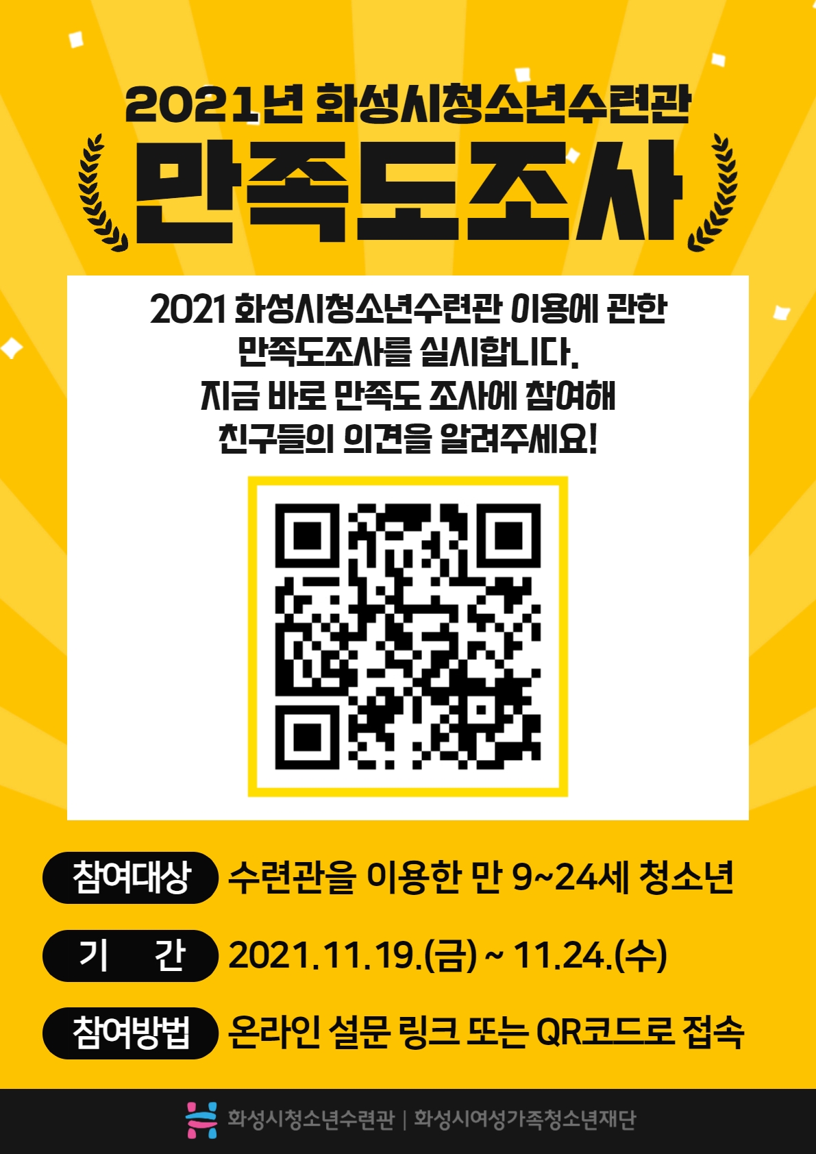 참여대상 : 화성시청소년수련관을 이용한 만 9~24세 청소년 참여기간 : 2021. 11.19.(금) ~ 11.24(수) 참여방법 : 온라인 설문 링크() 또는 QR코드로 접속 문 의 : 031-267-8852