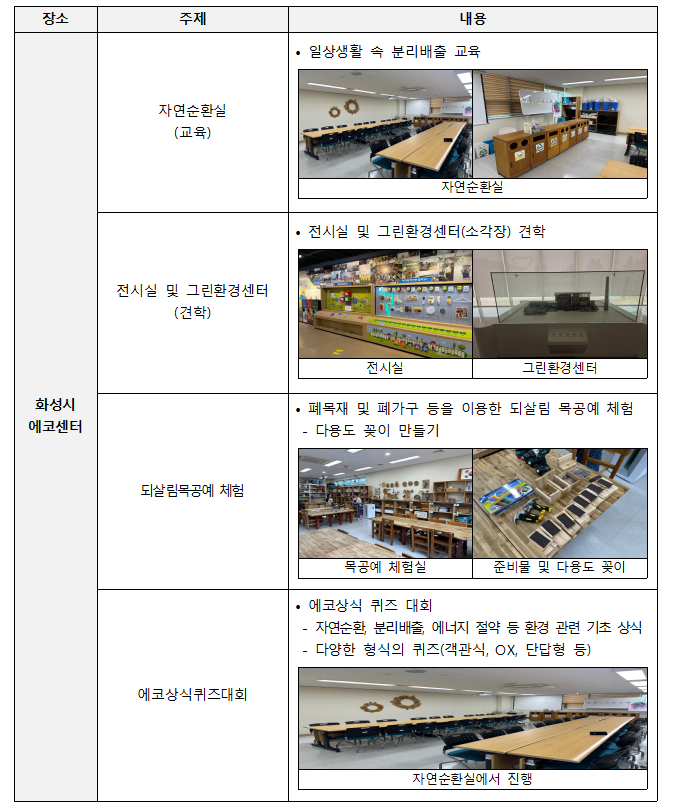 1) 활동안내 - 일 시 : 2025년 6월 21일 토요일 11:00 ~ 17:00 - 대 상 : 화성시 관내 11세(초등 4학년) ~ 13세(초등 6학년) 청소년 30명 - 장 소 : 화성시청소년수련관, 화성시에코센터 *집결장소: 화성시청소년수련관(유앤아이센터) 3층 강의실 1 - 내 용 : 1. 해설과 함께하는 자원순환교육 2. 되살림 목공 체험(다용도 꽂이 만들기) 3. 에코상식 퀴즈 대회 등