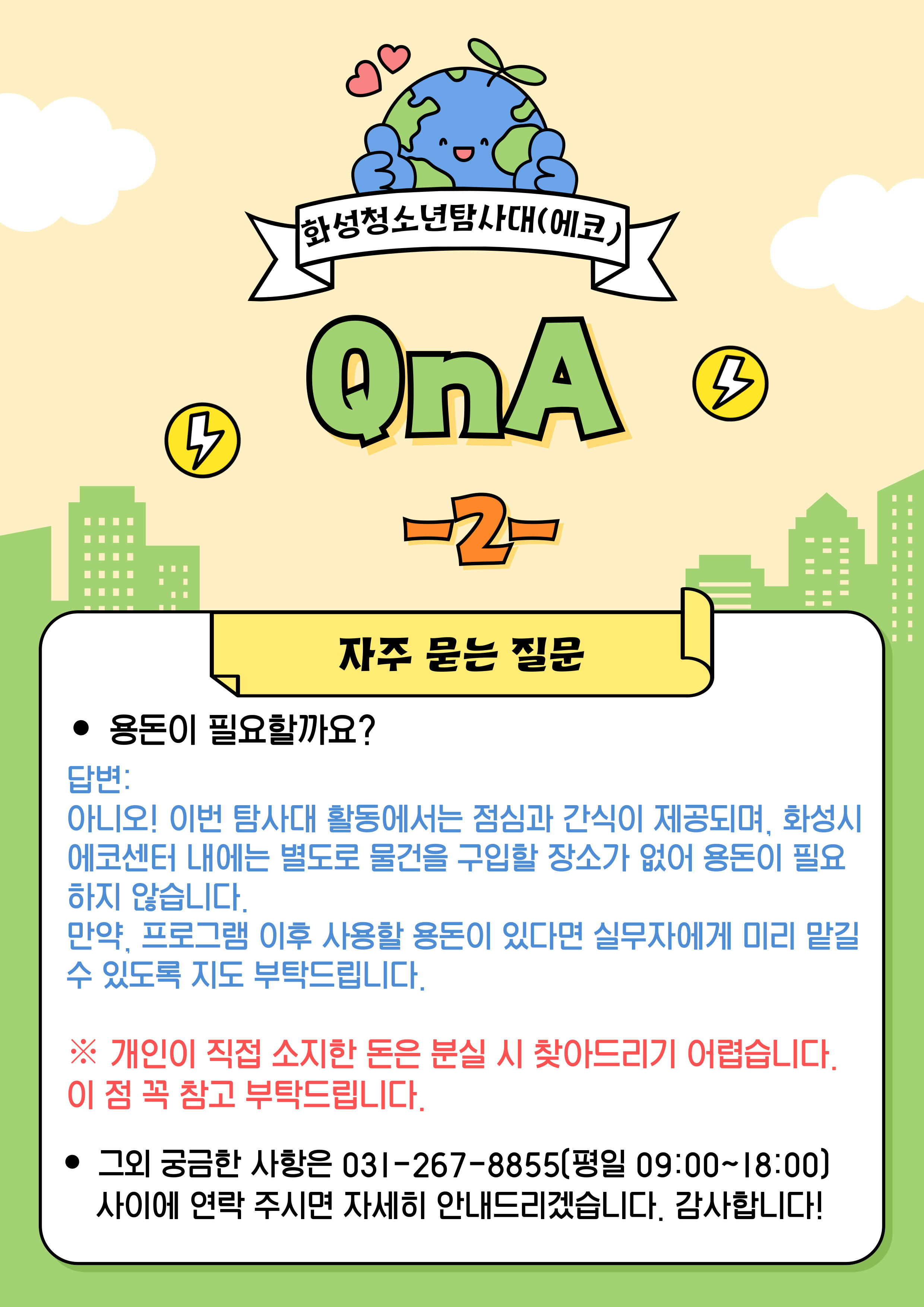 2. 방문 환불(부모님 계좌로 신청할 경우) 유앤아이센터 지하 2층 안내데스크 직접 방문하여 환불 신청 (전화 환불 불가) (가족 관계 증빙서류 지참 - 가족관계증명서, 주민등록등본 등 ) (평일 09:00~18:00 / 점심시간 12:00~13:00 제외) ※ 지역과 참가연령을 꼭 확인하시고 신청하시기 바랍니다. 화성시 미거주 시민 및 연령대에 맞지 않는 청소년의 신청 시 직접 방문하셔서 환불하셔야 합니다. ( 화성시 관내 11세 ~ 13세, 화성시 관내 초등학교 4학년 ~ 6학년 청소년 대상 ) ※ 환불받을 계좌 통장이 참가 청소년 이름과 동일해야 합니다. (적금통장 불가) ※ 부모님 계좌 통장으로 환불 하실 경우 가족관계를 증명할 수 있는 서류(가족관계증명서, 주민등록등본) 를 준비해주셔야 합니다.