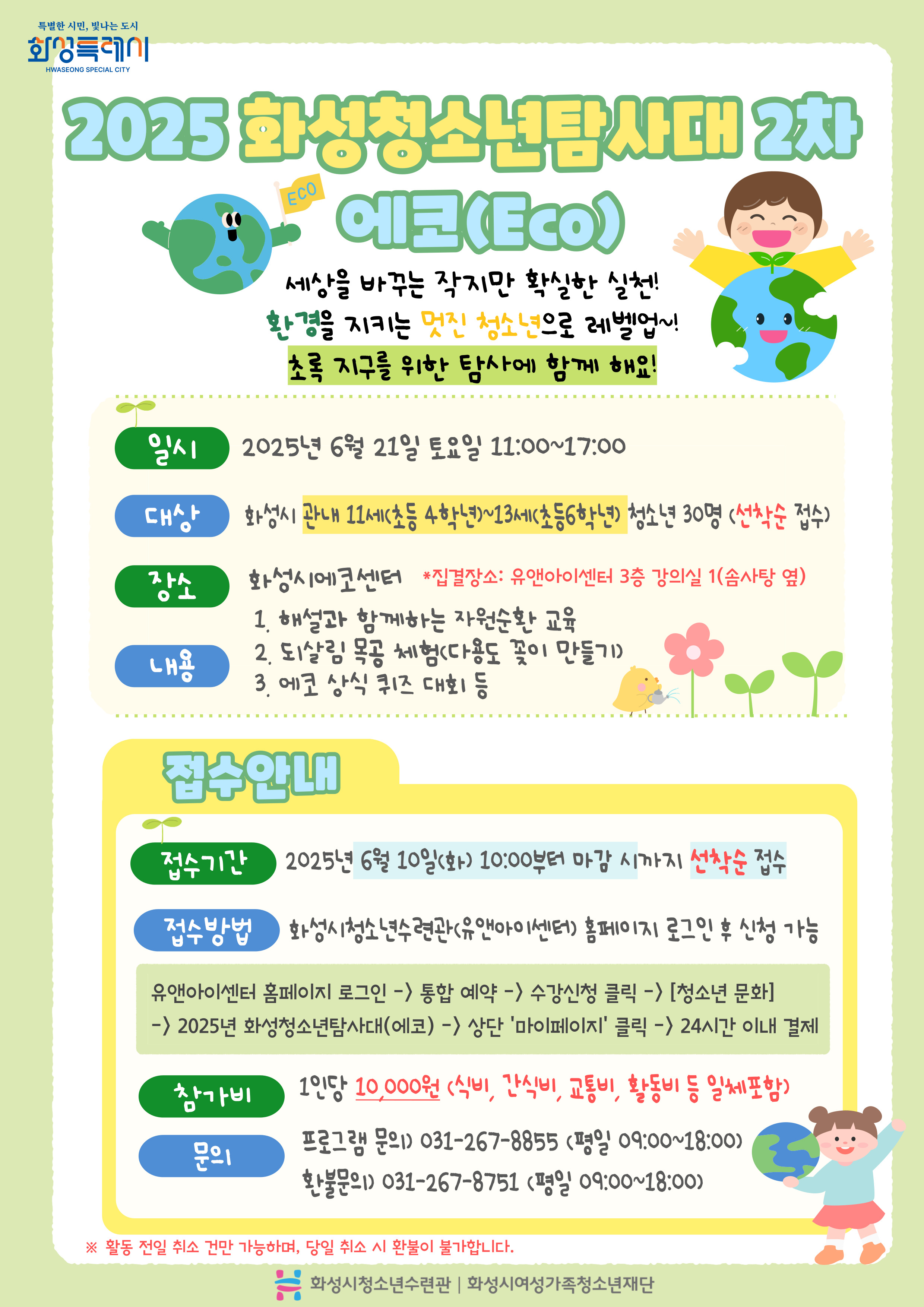 2) 신청안내 - 참가비 : 10,000원(식비, 간식비, 교통비, 활동비 등 일체포함) - 접수기간 : 2025년 6월 10일 화요일 10:00부터 마감 시 까지 선착순 접수 - 접수방법 : 화성시청소년수련관(유앤아이센터) 홈페이지 로그인 후 신청가능 *참가신청은 해당 연령(현 4학년 이상) 청소년 아이디로 신청 [ 유앤아이센터 홈페이지 로그인 → 통합예약 → 수강신청 클릭 → (센터) 유앤아이센터 → (유형) 화성시청소년수련관 → (분류) 청소년문화 → 2025화성청소년탐사대 2차(에코) → 상단 '마이페에지' 클릭 → 24시간 이내 결제 ] ☆ 강좌명: '탐사대' 검색해서 찾으실 수 있습니다.