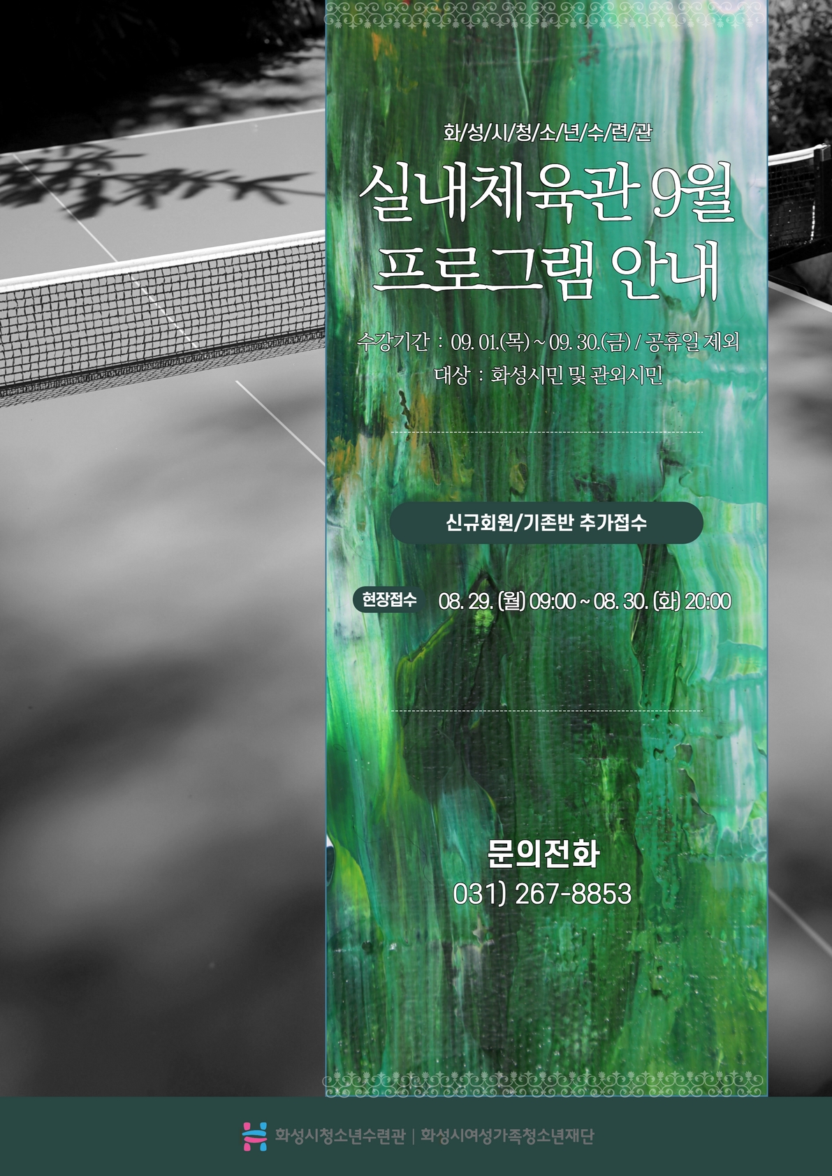 | 제목 | [화성시청소년수련관] 9월 실내체육관 신규 및 추가모집 잔여인원 안내 (8. 27. 09:00 기준) | ||