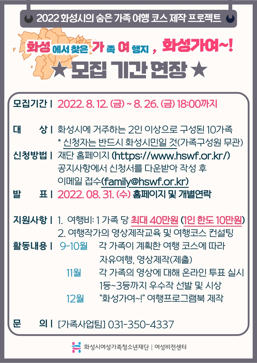 | 제목 | [화성시여성비전센터] 화성가여~! 참가 가족 모집 (기간 연장) | ||