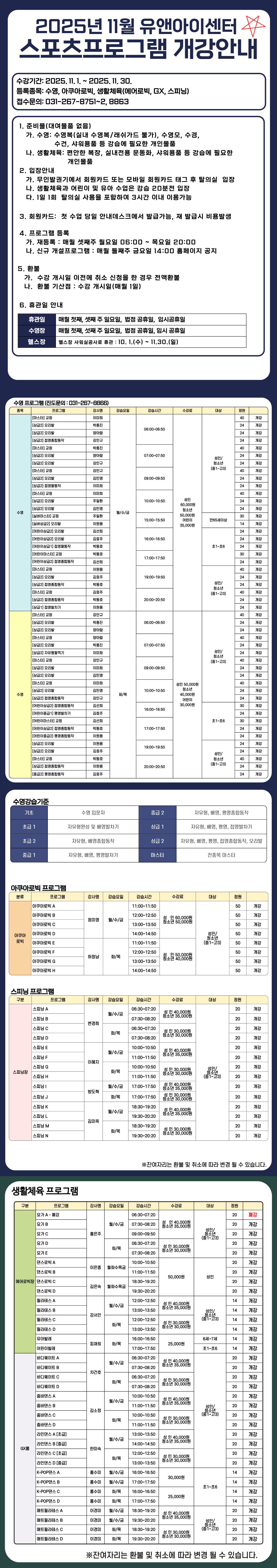 제목 2025년 11월 스포츠프로그램[수영, 아쿠아로빅, 에어로빅, GX, 스피닝] 개강안내 운영센터 유앤아이센터 작성일 2025년 10월 31일 9시 3분 조회수 1,095 첨부 파일 아이콘25년 11월 개강공지.jpg (2.19MB)다운로드 아이콘 2025년 11월 스포츠프로그램[수영, 아쿠아로빅, 에어로빅, GX, 스피닝] 개강안내 목록보기