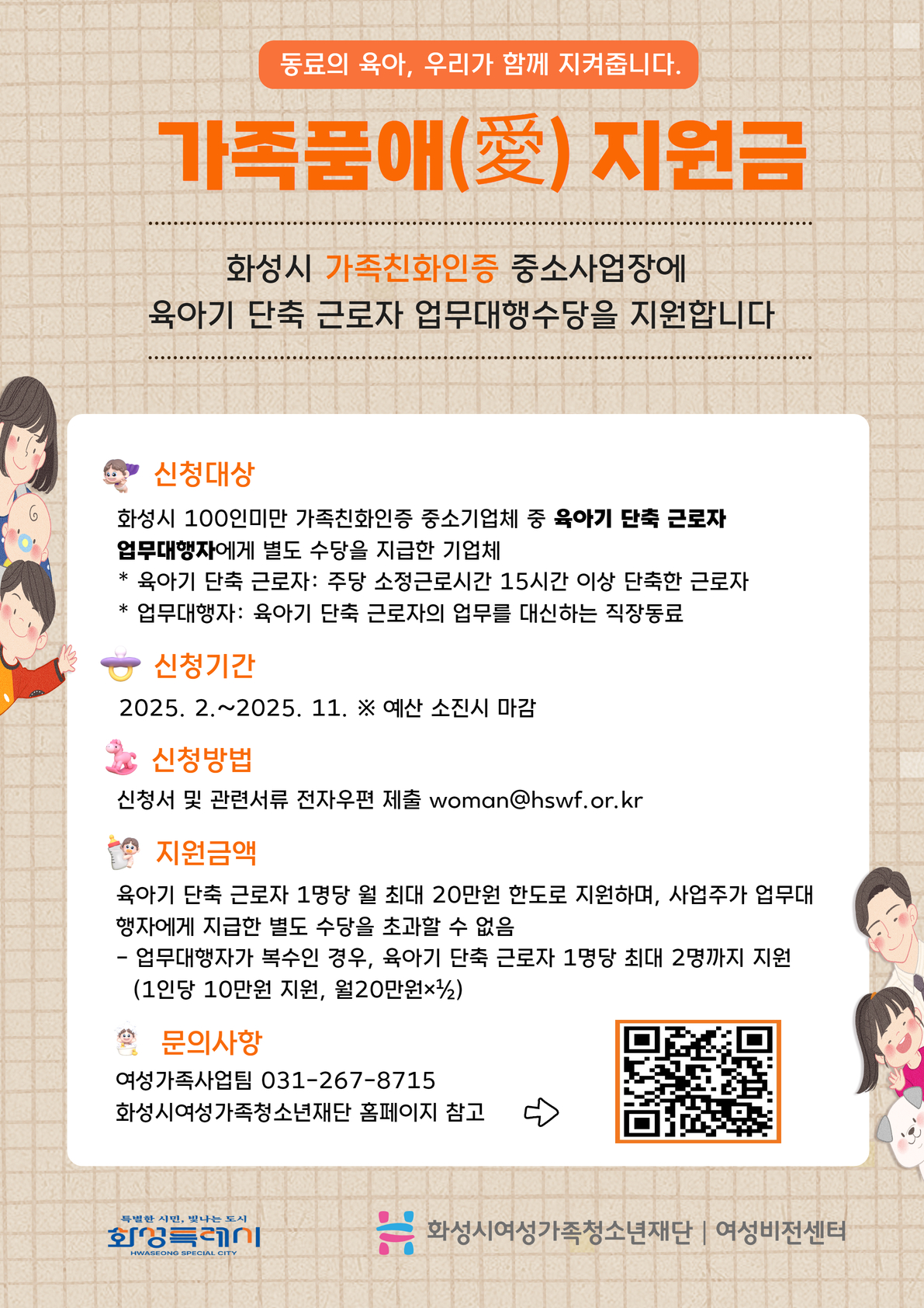 제목 [화성시여성비전센터] 2025년 '가족품애(愛)지원금' 육아기 단축근로자 수당 지원 공고