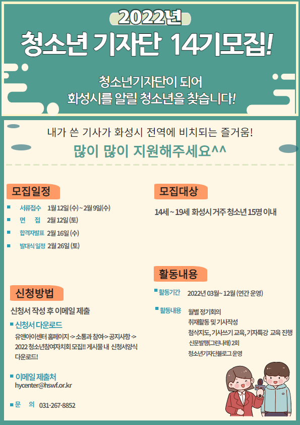 제목 [화성시청소년수련관] 화성시청소년기자단 14기 모집!