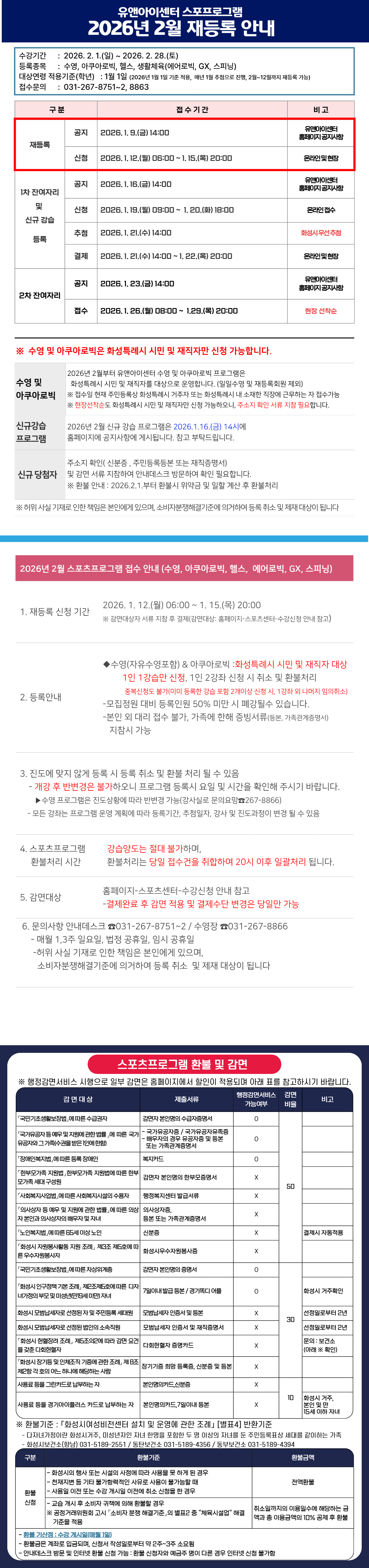 제목 [유앤아이센터] 2026년 2월 스포츠프로그램 재등록 안내 [수영,아쿠아로빅,헬스,에어로빅,GX,스피닝] 운영센터 유앤아이센터 작성일 2026년 1월 9일 9시 28분 조회수 1,823 첨부 파일 아이콘26년 1월 개강공지 (2).jpg (1.99MB)다운로드 아이콘 ※ 수영 및 아쿠아로빅은 화성특례시 시민 및 재직자만 신청 가능합니다. 목록보기