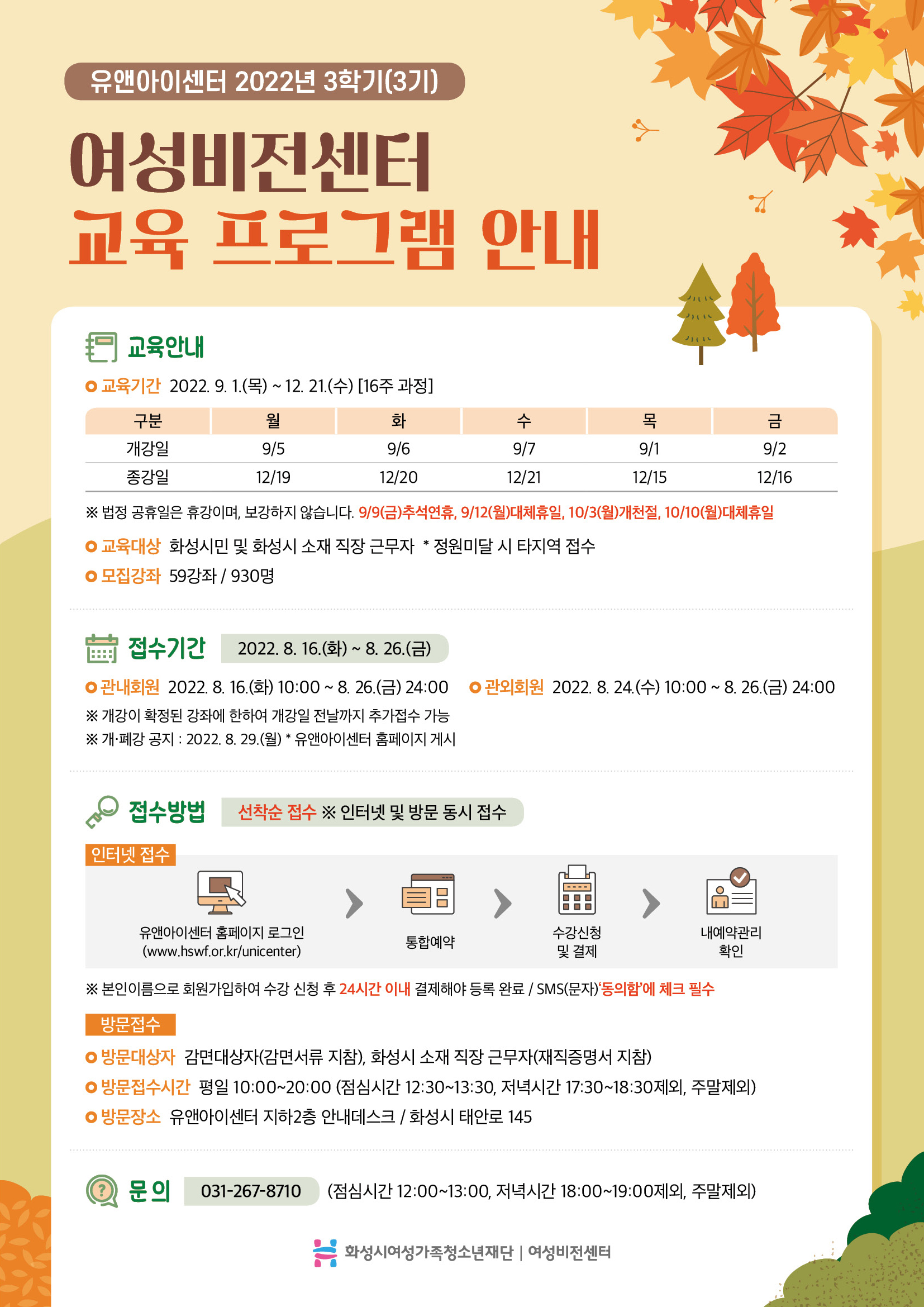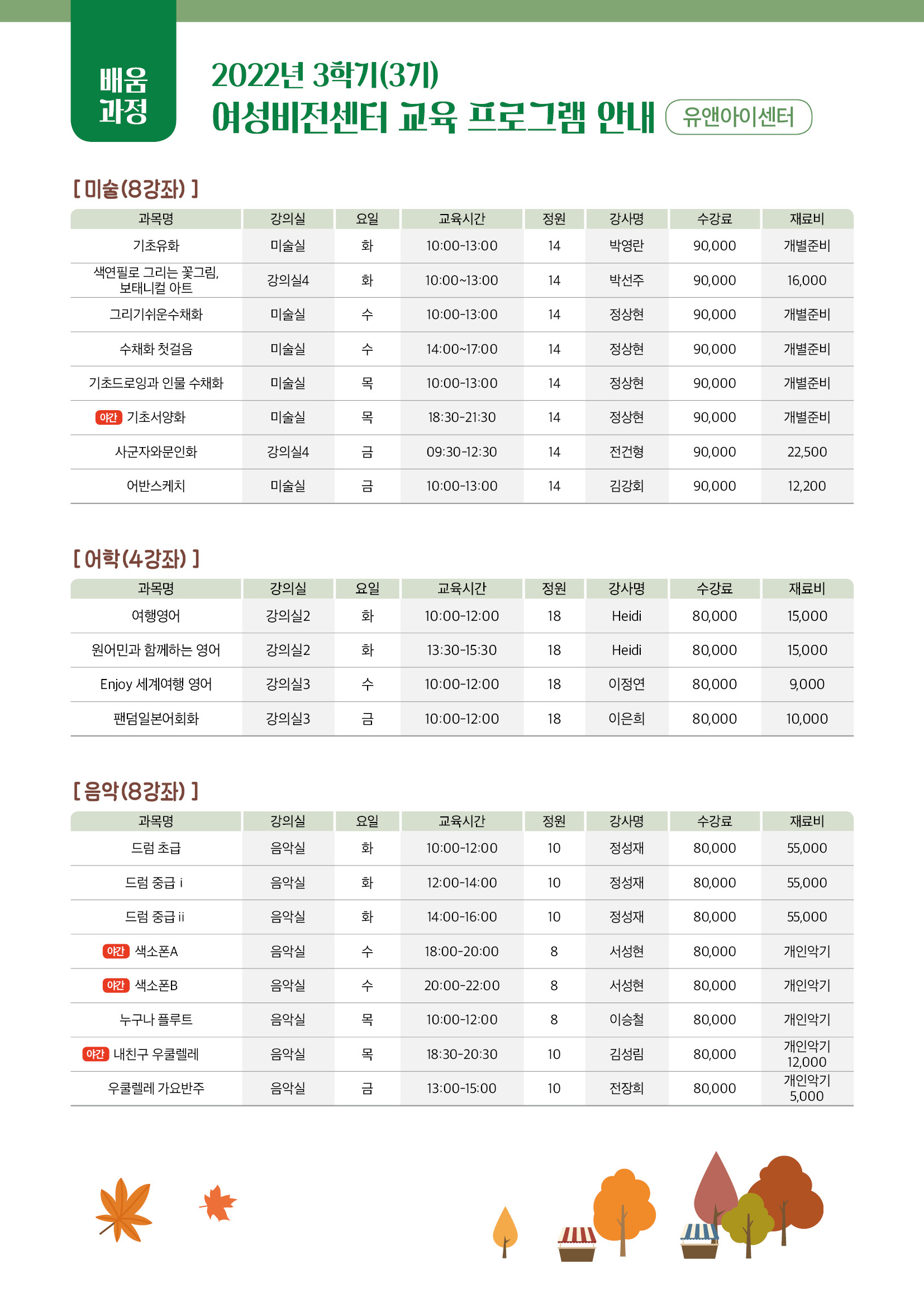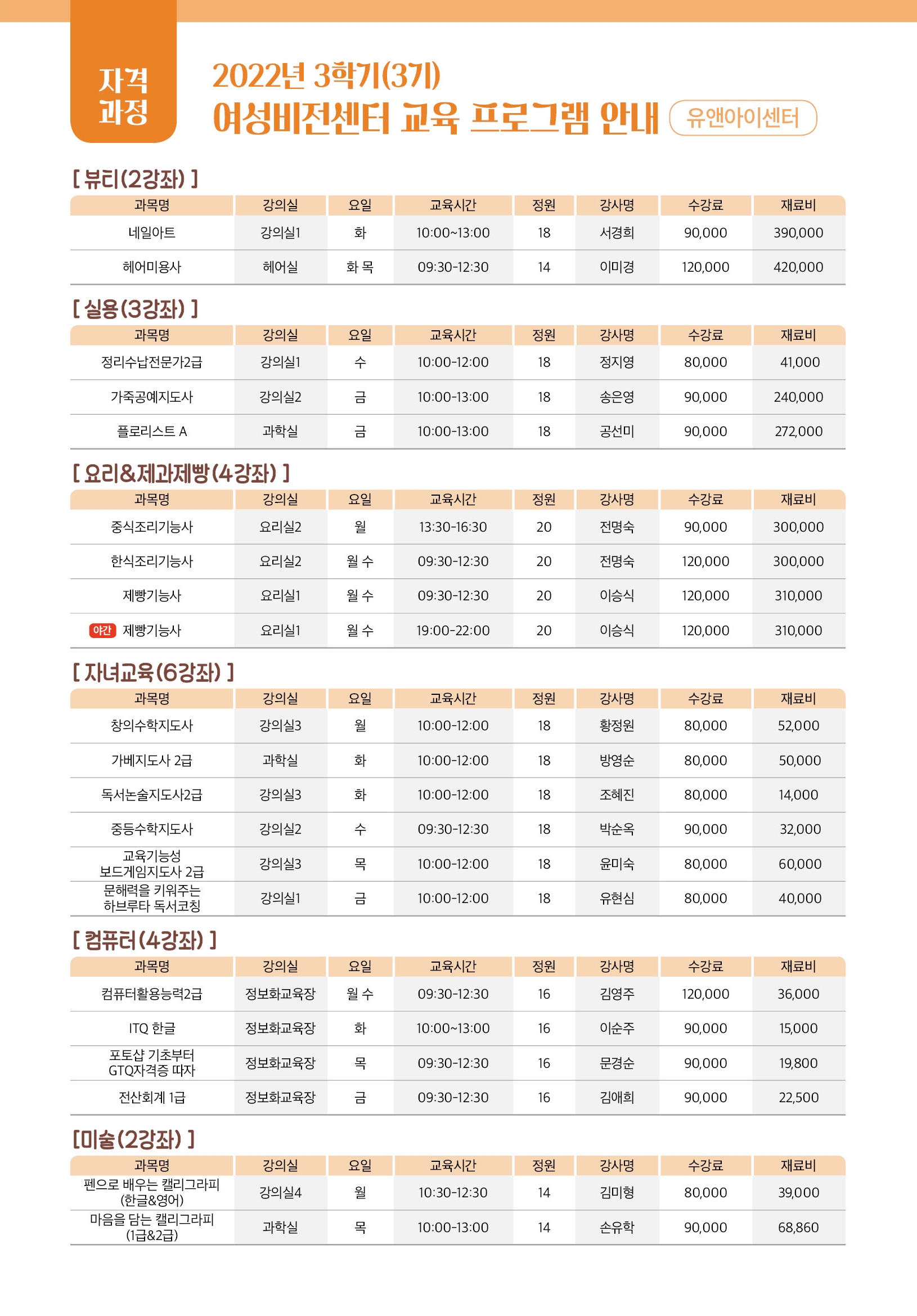 제목 [유앤아이센터] 2022년 3학기(3기) 여성비전센터 교육프로그램 안내 운영센터 유앤아이센터 작성일 2022년 8월 1일 9시 13분 조회수 6,754 첨부 파일 아이콘민간자격정보(3학기).pdf (296.25KB)다운로드 아이콘 *민간자격증 정보는 붙임문서를 참조해주세요. 목록보기