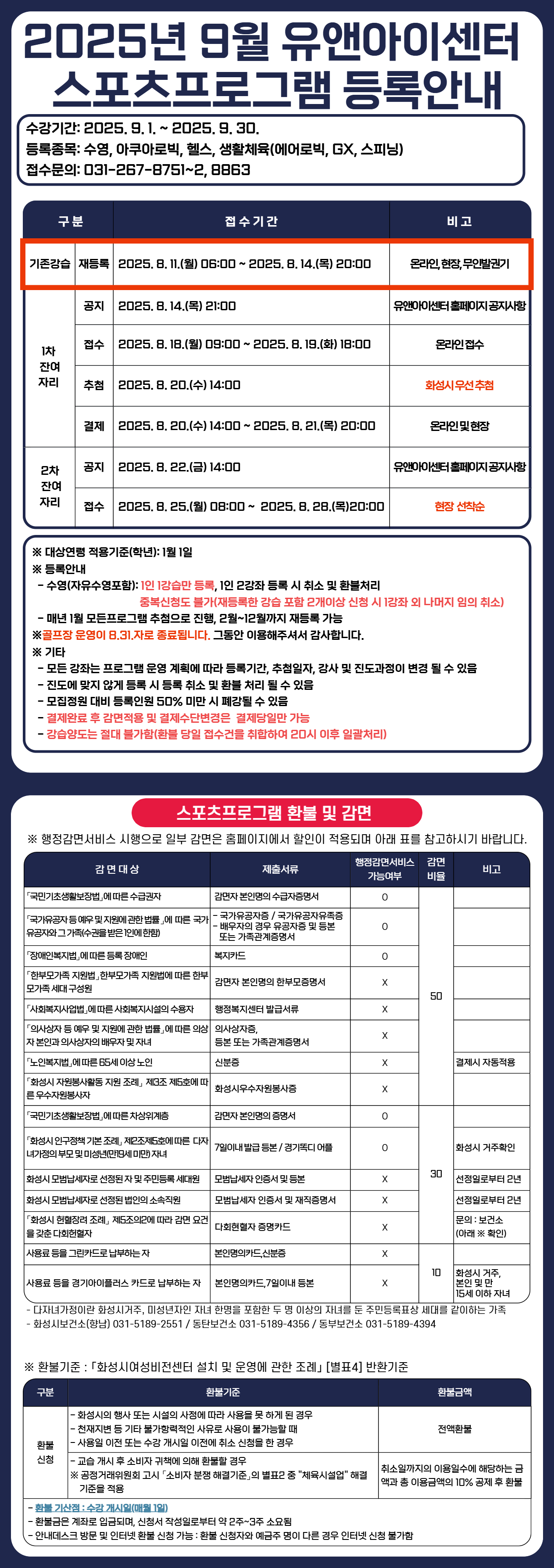 - 수영 : 1인 1강좌만 등록, 1인 2강좌 등록 시 등록취소 및 환불 처리, 중복신청도 불가(재등록한 강좌 포함 2개 이상 신청시 1강좌외 나머지는 임의로 취소처리)