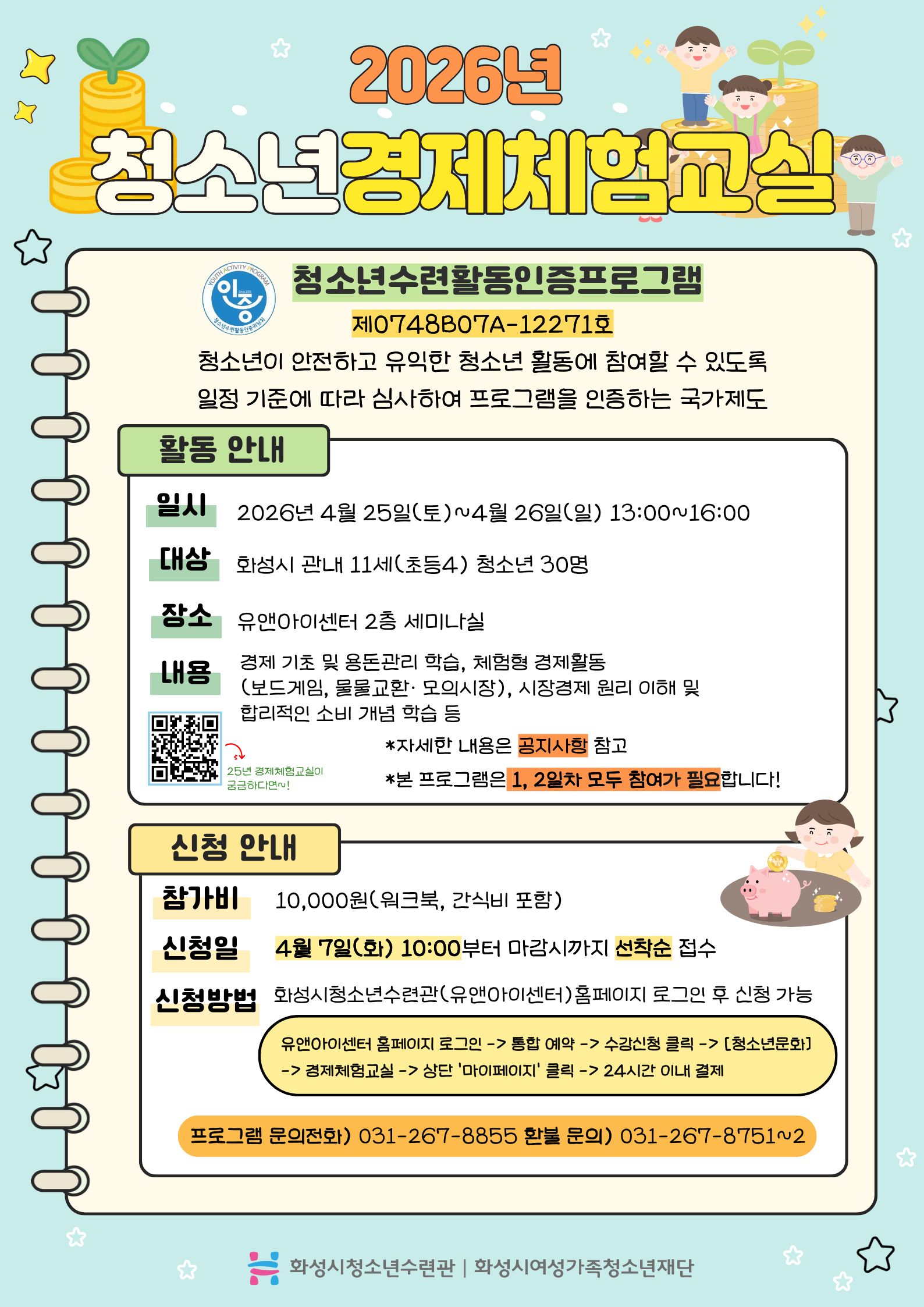 ★ 프로그램 안내 ★ 1) 활동안내 - 일시: 2026년 4월 25일 토요일 13:00~16:00, 4월 26일 일요일 13:00~16:00 (★양일 참석 필수) - 대상: 화성시 관내 11세(초등 4학년) 30명 - 장소: 유앤아이센터 2층 세미나실 - 내용: 경제 기초 및 용돈관리 학습, 체험형 경제활동(보드게임, 물물교환· 모의시장), 시장경제 원리 이해 및 합리적인 소비 개념 학습 등