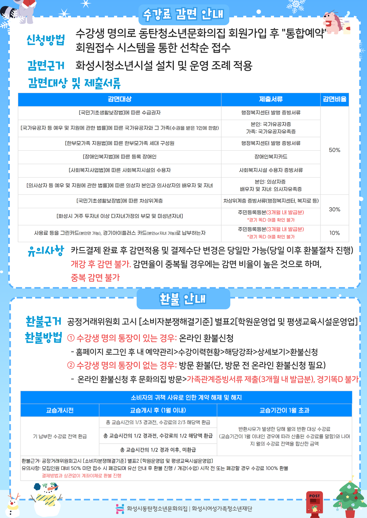 수강신청은 선착순 접수로 진행되며, 1월 14일(화) 오전 10시에 시작됩니다. 선착순 접수이므로 접수기간 전에 미리 회원가입해두시는 것을 추천드립니다. * 감면 대상 중 다자녀와 아이플러스, 그린카드 사용자의 경우 주민등록등본만 제출서류로 인정하오니 이점 양해부탁드립니다. * 감면을 원하실 경우 온라인 수강신청 시 행정감면서비스 조회를 통해 감면 혜택 적용이 가능하며. 서비스 적용이 불가한 자에 한하여 온라인 선착순 접수 후 증빙서류 지참하여 방문결제(온라인 결제하지 마시고 접수 24시간 이내에 꼭 방문결제 요청드립니다.) * 강좌 개강 확정 공지 이후 감면 적용 불가합니다(1월 24일(금) 강좌 개강 확정 공지 예정). * 환불은 결제방법과 관계없이 계좌환불만 가능합니다.