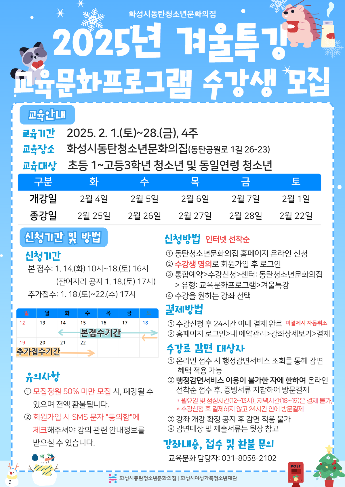 | 제목 | [동탄청소년문화의집] 2025년 겨울특강 교육문화프로그램 수강생 모집 안내 | ||