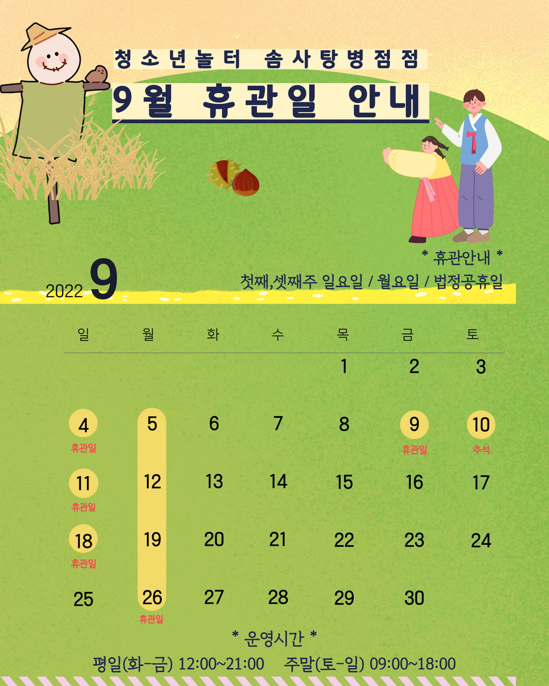 [화성시청소년수련관] 청소년놀터 병점점 9월 휴관일 안내