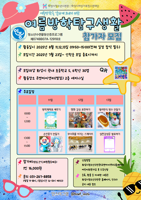 | 제목 | [화성시청소년수련관] 2025 여름방학 탐구생활 참가자 모집 | ||||||||||||
