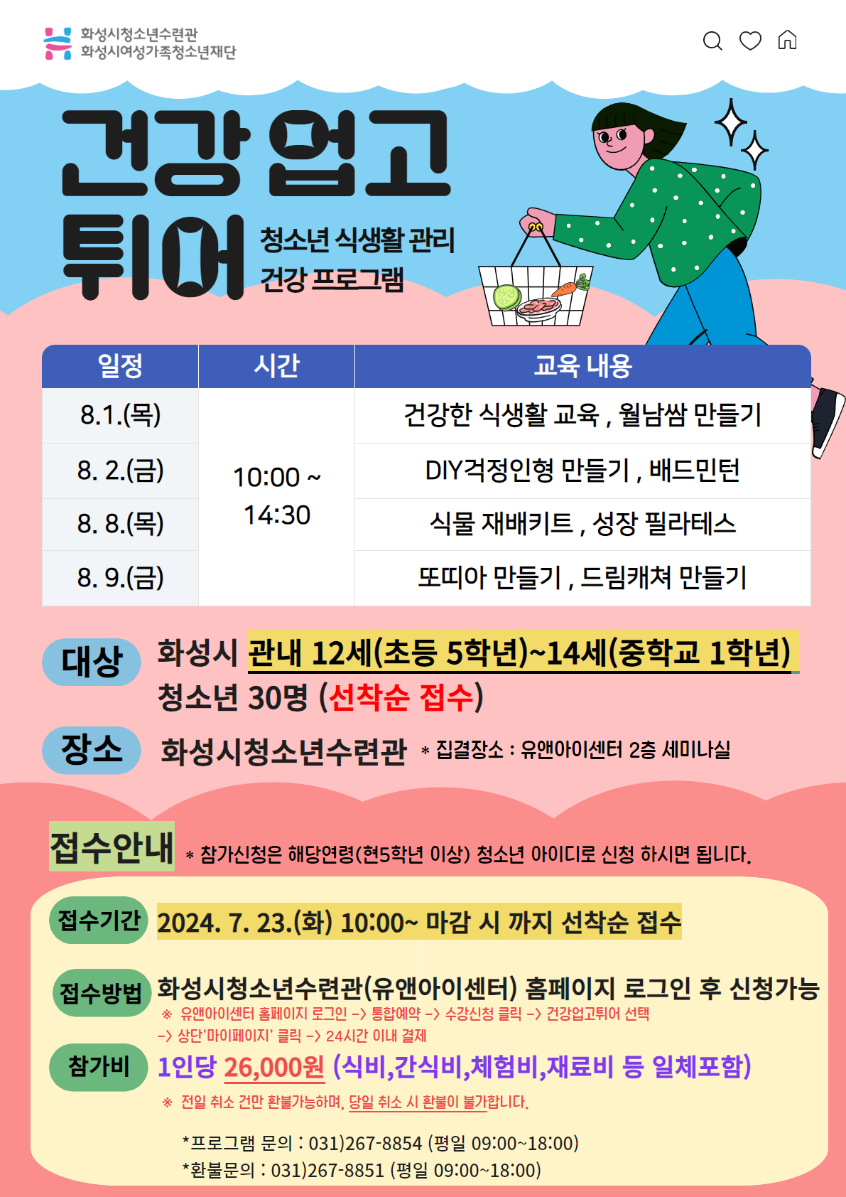 - 대상: 화성시 관내 12세 이상 청소년(초등학교 5학년)~14세(중학교 1학년) 30명 선착순 신청