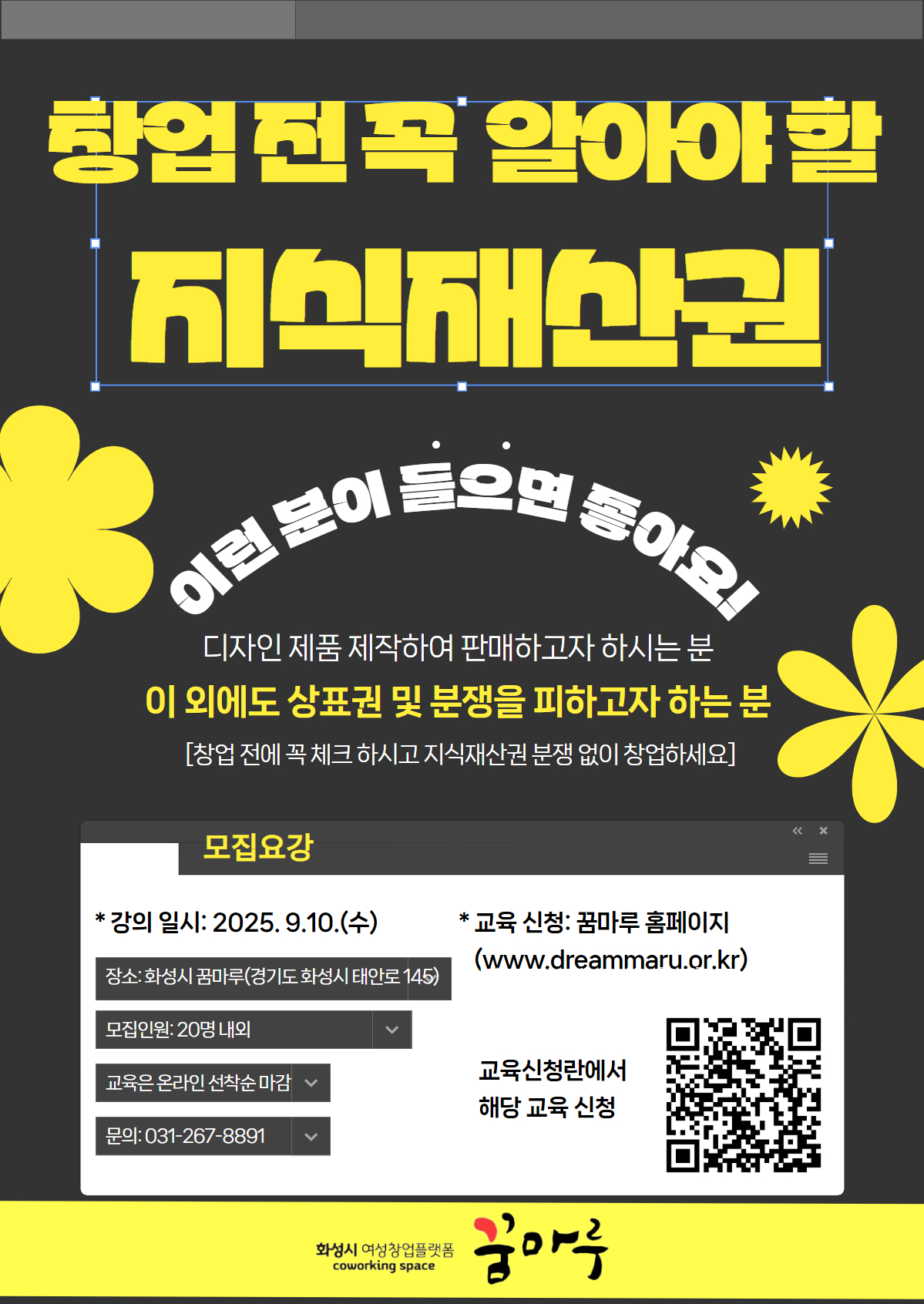창업 전 꼭 알아야 할 지식재산권 성공적인 창업을 위한 필수 지식, '지식재산권'을 제대로 알고 시작하세요. 지식재산권을 모르면, 내 아이디어가 남의 것이 될 수도 있습니다. 지금 '지식재산권 창업 특강'에서 창업 전 꼭 알아야 할 핵심 정보를 만나보세요! 1. 모집개요 -교육명: 창업 전 꼭 알아야 할 지식재산권 -일 시: 9. 10.(수), 10:00 ~13:00 (총 1일간 3시간 교육) -대 상: 화성시 꿈마루 회원 (예비 및 초기 여성창업자) -교육장소: 화성시 꿈마루 (유앤아이센터 1층) -교육비: 수강료 전액 지원 (무료) -모집인원: 20명 내외(홈페이지 선착순 접수) 2. 신청방법 ‘화성시 꿈마루 소속’으로 꿈마루 홈페이지 가입 후, 꿈마루 홈페이지 교육정보에서 창업특강 신청 >>>>> 신청하기 바로 가기