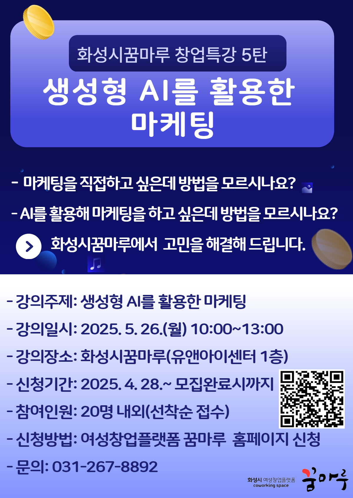 [화성시꿈마루] 2025년 창업특강 5탄. 생성형 AI를 활용한 마케팅 교육 신청자 모집 화성시꿈마루가 준비한 2025년 창업특강 5탄 사업운영에 필요한 마케팅 때문에 어려움을 겪고 계신가요? 생성형 AI로 마케팅 쉽게 할 수 있는 방법을 알려드립니다. 1. 모집개요 -교육명: 생성형 AI를 활용한 마케팅 -일 시: 2025. 5. 26.(월) 10:00~13:00 (총3시간) -대 상: 화성시 꿈마루 회원 (예비 및 초기 창업자) -교육장소: 화성시꿈마루 (화성시 태안로 145, 유앤아이센터 1층) -교육비: 수강료 전액 지원 (무료) -모집인원: 20명 내외(홈페이지 선착순 접수) -접수기간: 2025. 5. 2.(금) ~ 모집완료시까지 2. 교육커리큘럼 - 생성형 AI를 마케팅에 적용할 수 있는 방법 - 생산성을 높이는 AI툴 및 프롬프트 작성방법 *문의: 031-267-8892 |