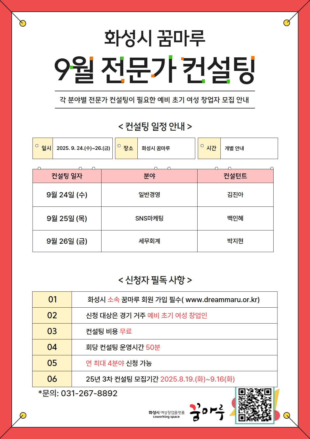 ○ 발 표: 9월 18일(목) 오전 9시 이후 개별 통보, 컨설팅 세부 일정 안내 ○ 장 소: 화성시 꿈마루(경기도 화성시 태안로 145 유앤아이센터 1층) ○ 컨설팅 시간: 회당 50분 ○ 컨설팅비: 전액지원 ○ 문 의: 031-267-8892 ○ 홈페이지: https://www.dreammaru.or.kr/www/selectEdcInfoView.do?key=3632&edcInfoNo=7926