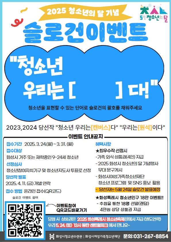 - 문의: 031-267-8854 (평일 9~18시 문의가능) * 당첨시 상품권은 2025 화성특례시 청소년축제장에서 지급합니다.(별도연락) - (최우수작 및 18명 당첨자 해당) * 우리 5. 24. (토) 13시 동탄 센트럴파크에서 만나요!