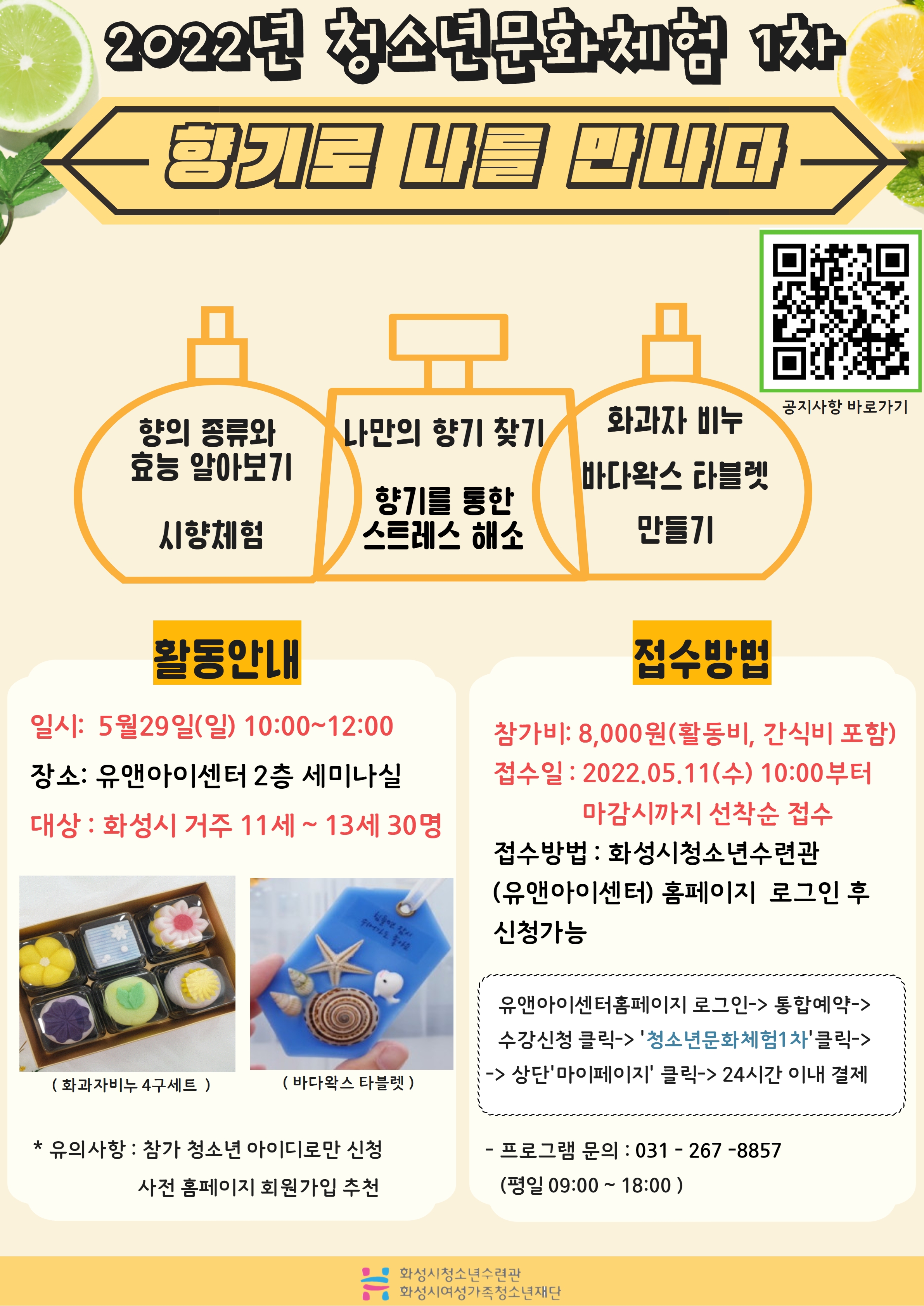 1. 프로그램 안내 (접수마감_대기자신청가능) 1) 일시 : 2022. 5. 29.(일) 10:00 ~ 12:00 (09시50분까지 2층 세미나실로 집결) 2) 장소 : 유앤아이센터 2층 세미나실 3) 대상 : 화성시 관내 11세~13세 청소년 30명 (초등학교 4~6학년 대상) 선착순 접수 4) 내용 - 향기에 대해 알아보기 : 향의 종류와 향에 담긴 효능 알아보기, 나만의 향기 찾기(시향 체험),향을 통한 스트레스 해소방법 찾기 - 향기 제품 만들어보기 : 화과자 비누(4구)세트 만들기, 바다왁스 타블렛 만들기 2. 참가 신청방법 1) 참가비 : 1명당 8,000원(활동비, 간식비 포함) 2) 접수기간 : 2022. 5. 11. (수) 오전 10시부터 마감시 까지 3) 접수방법 : 홈페이지 회원접수시스템을 이용한 선착순 접수